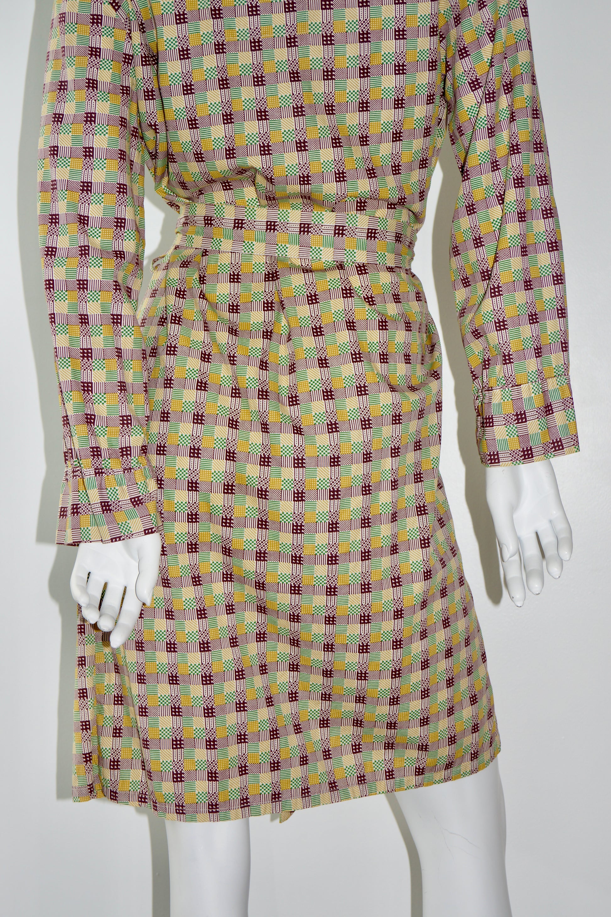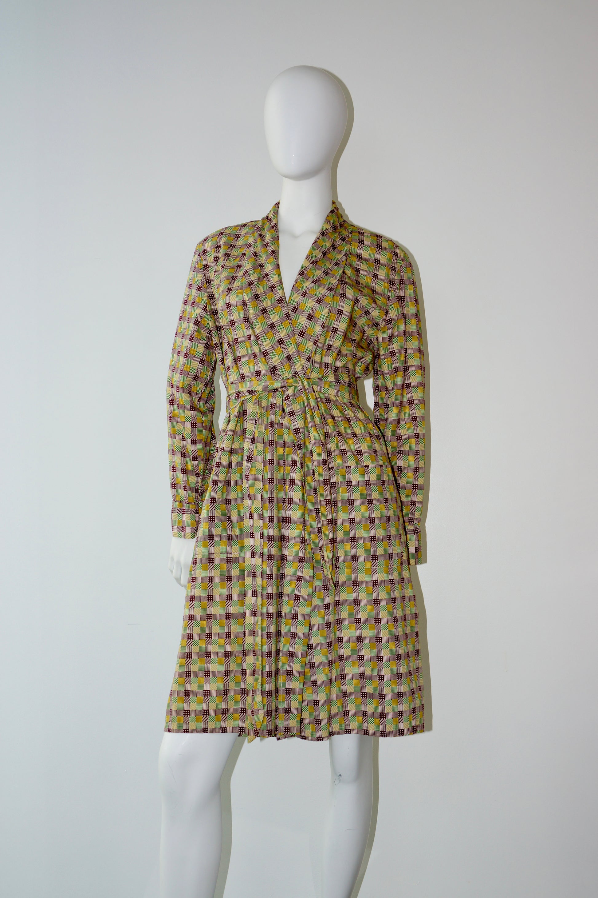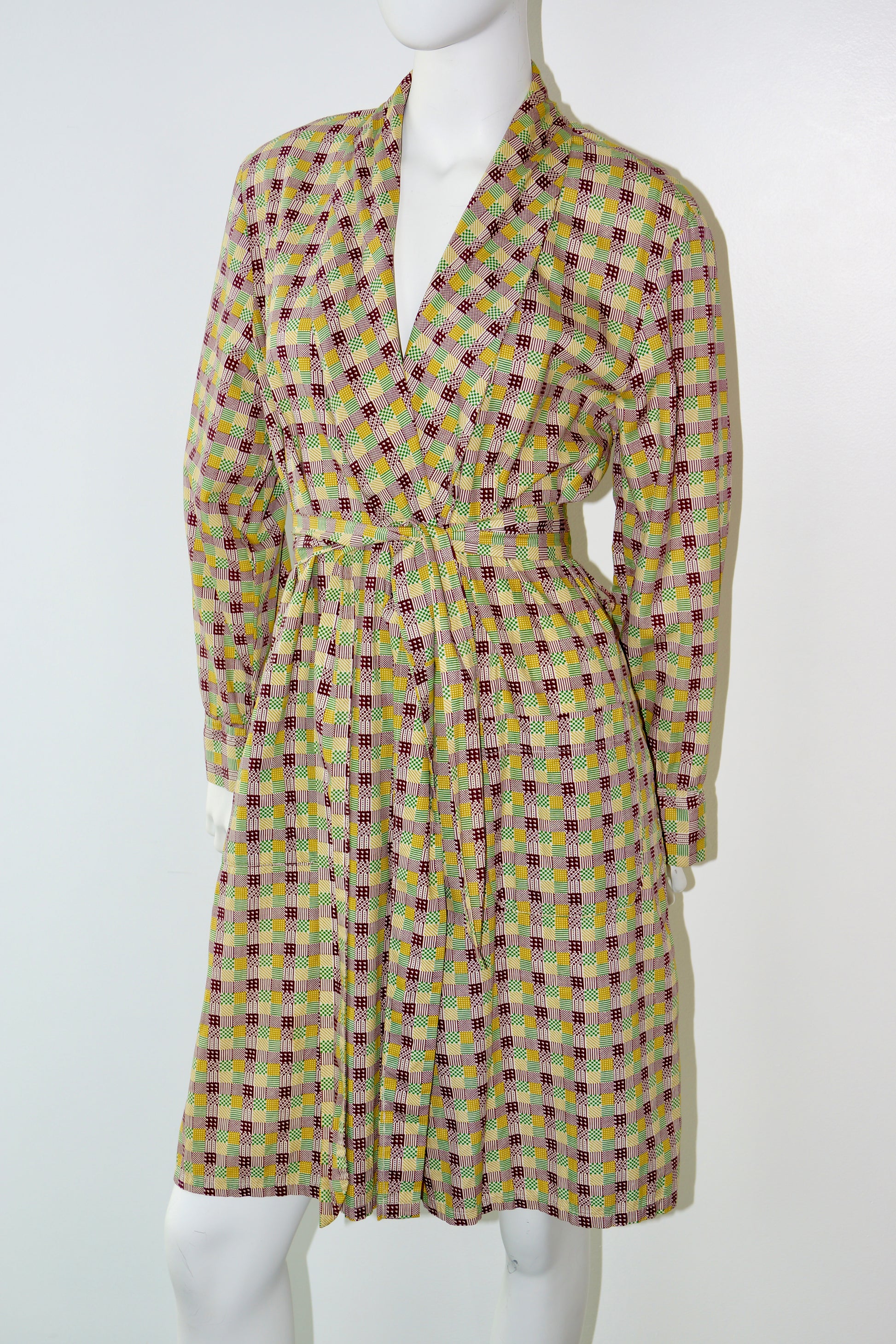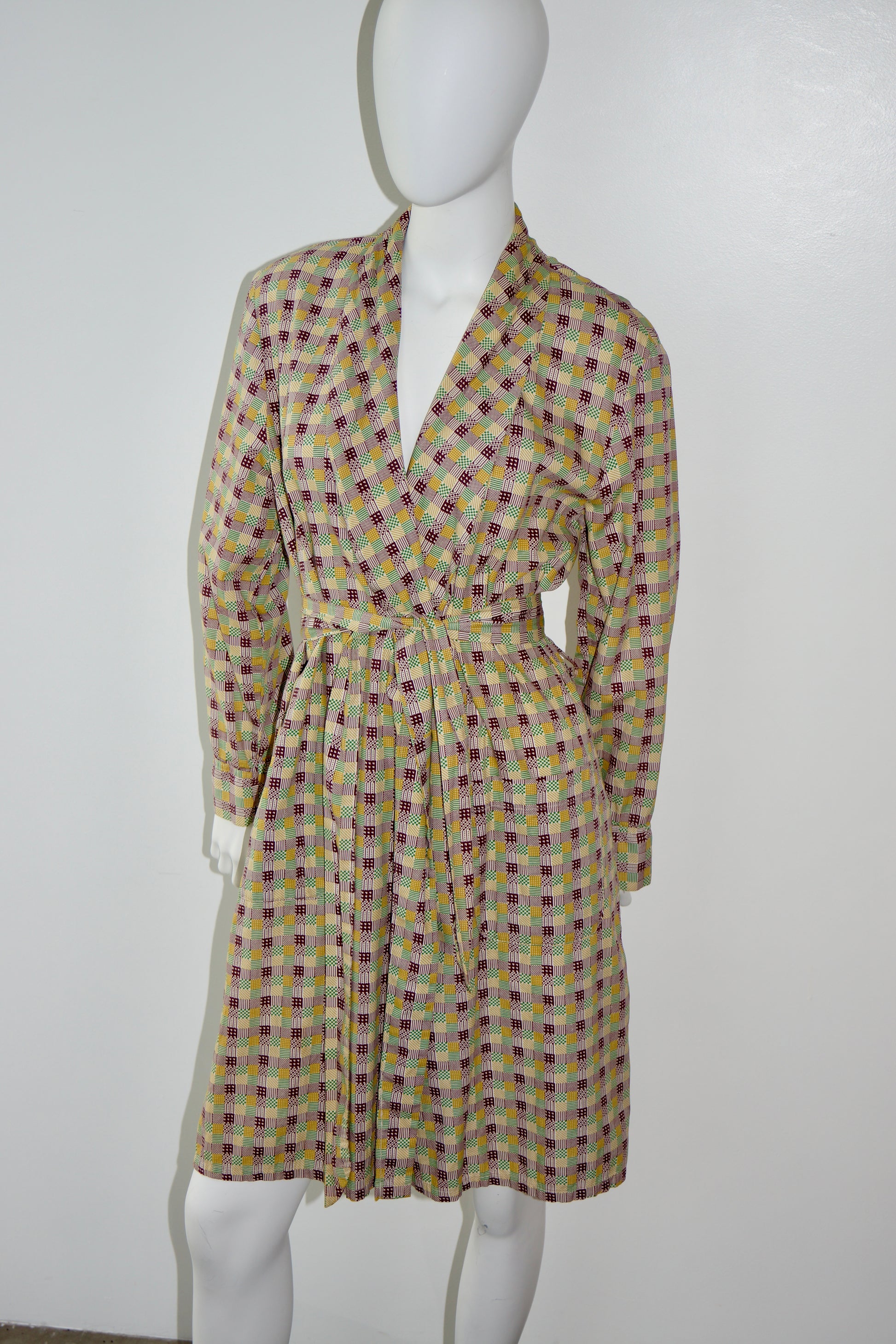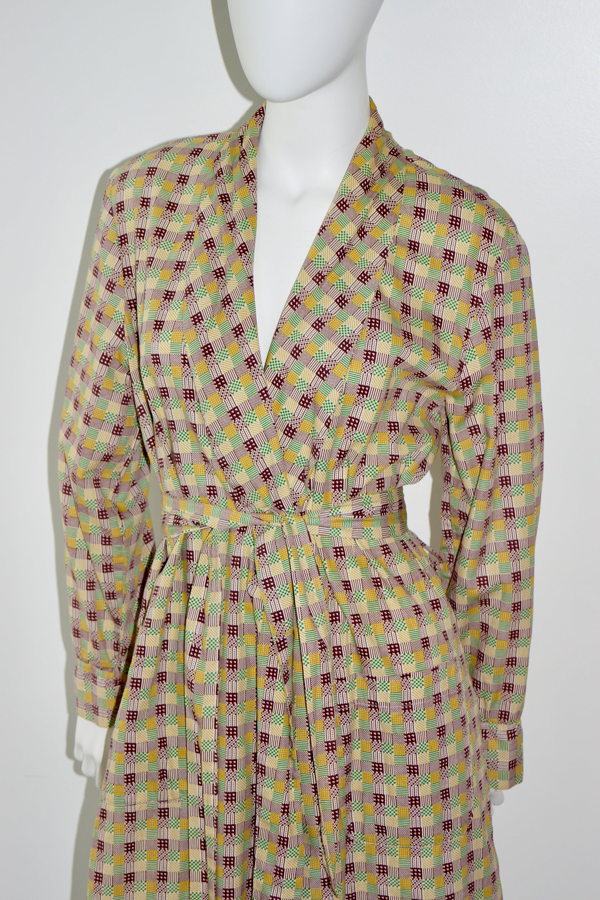 1940s Cotton Day Robe – Graphic Check Print. Harcourt Made in USA. Step into the charm of the 1940s with this beautifully preserved cotton robe, featuring a playful yet refined multicolor check print in soft tones of maroon, green, yellow. Crafted from breathable, lightweight cotton, this robe boasts a flattering wrap silhouette with a V-neck shawl collar, gathered waistline, and matching tie belt to accentuate the figure. Long sleeves and mid-length hem make it perfect for lounging in style or layering as a day dress. Or even a beach cover up OR just layered with jean shorts and a Tee.