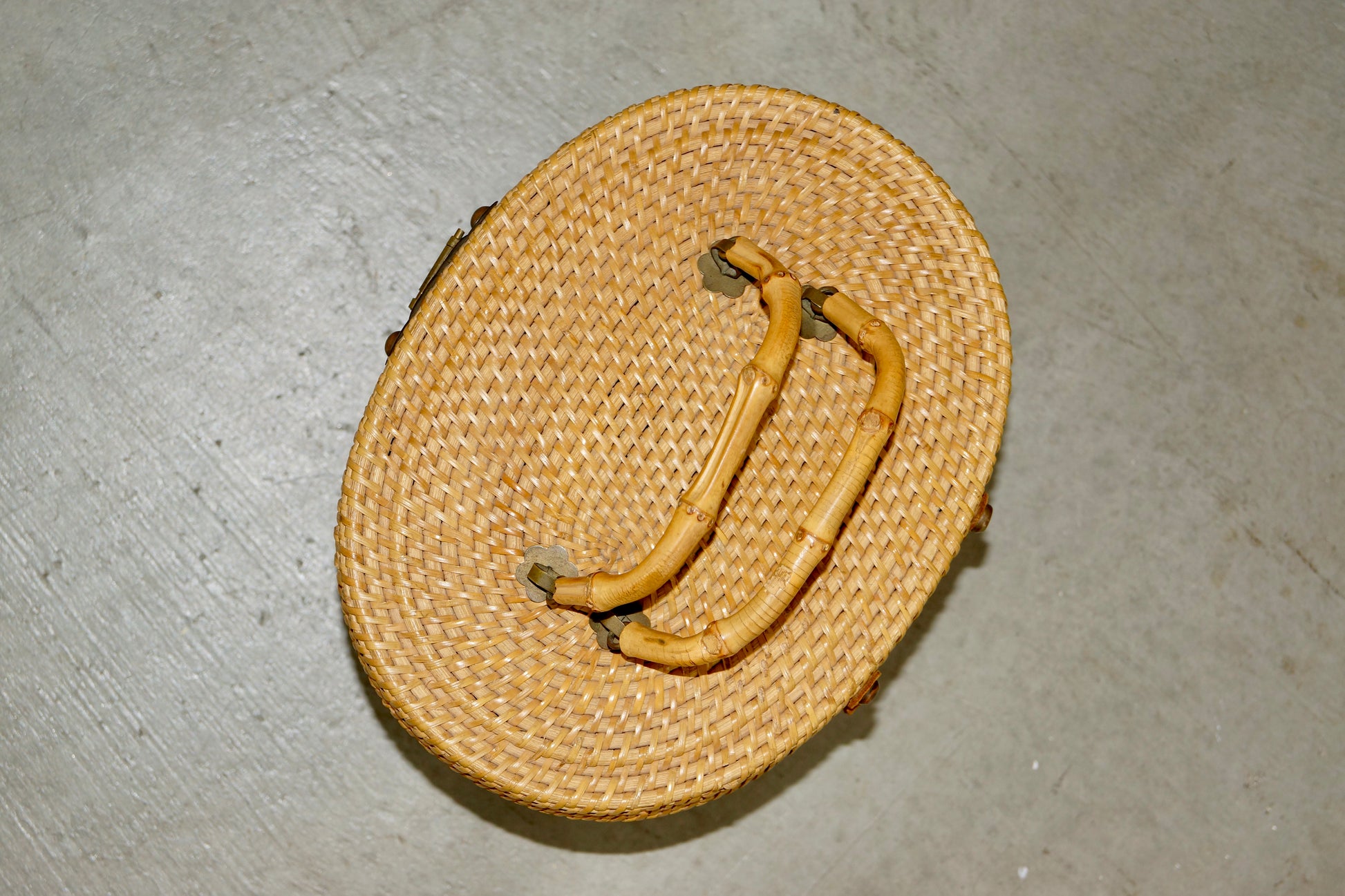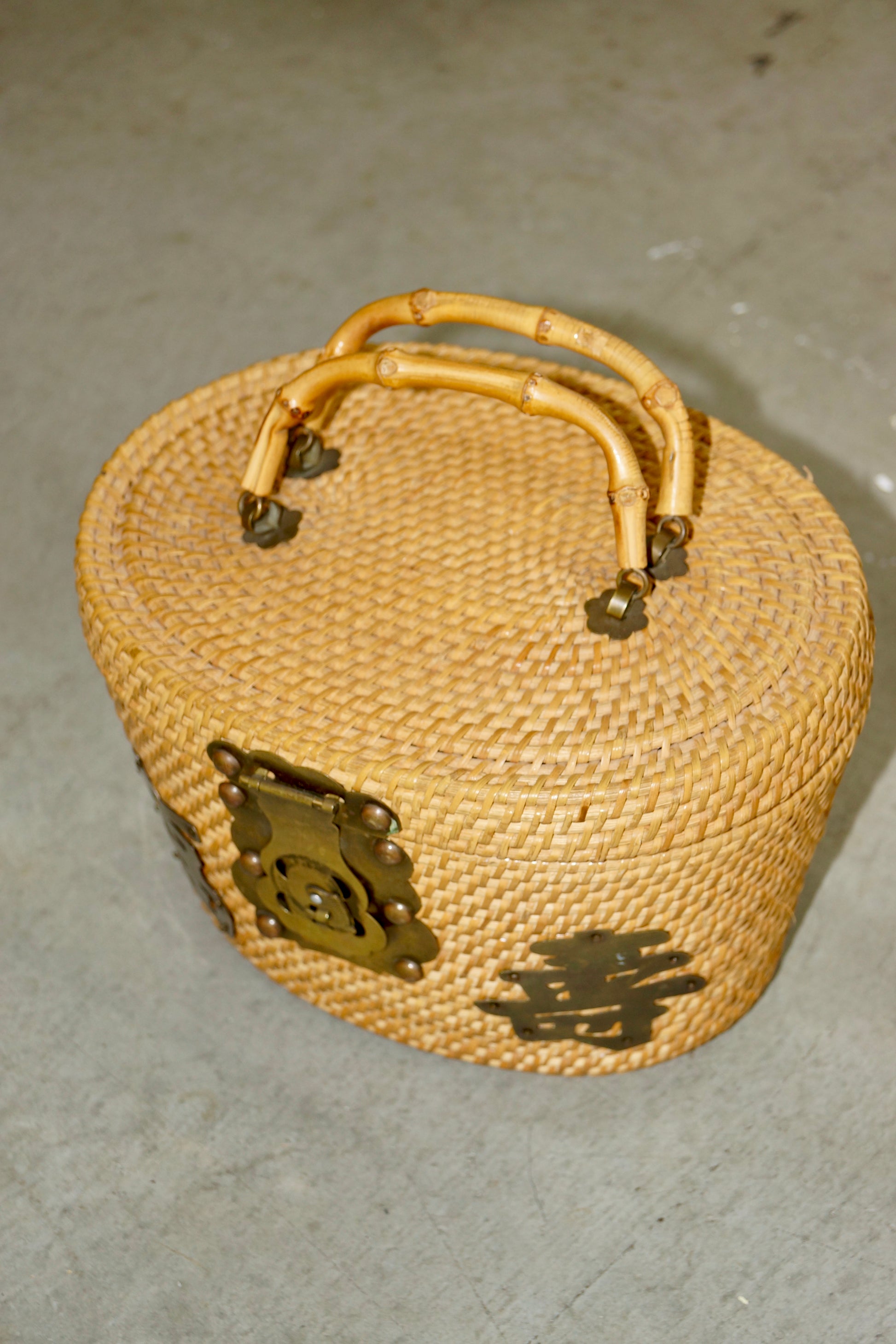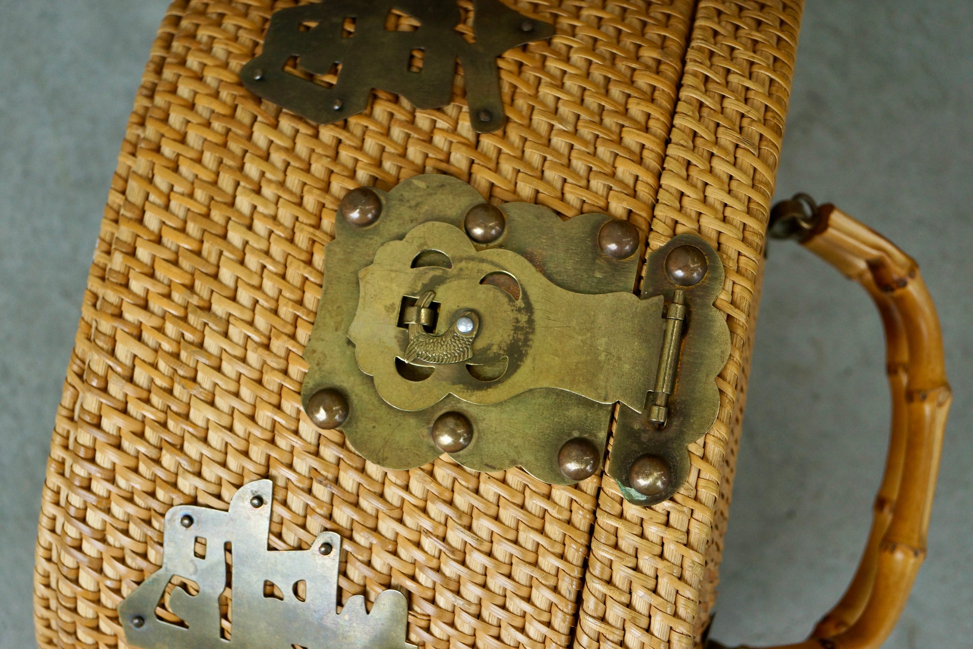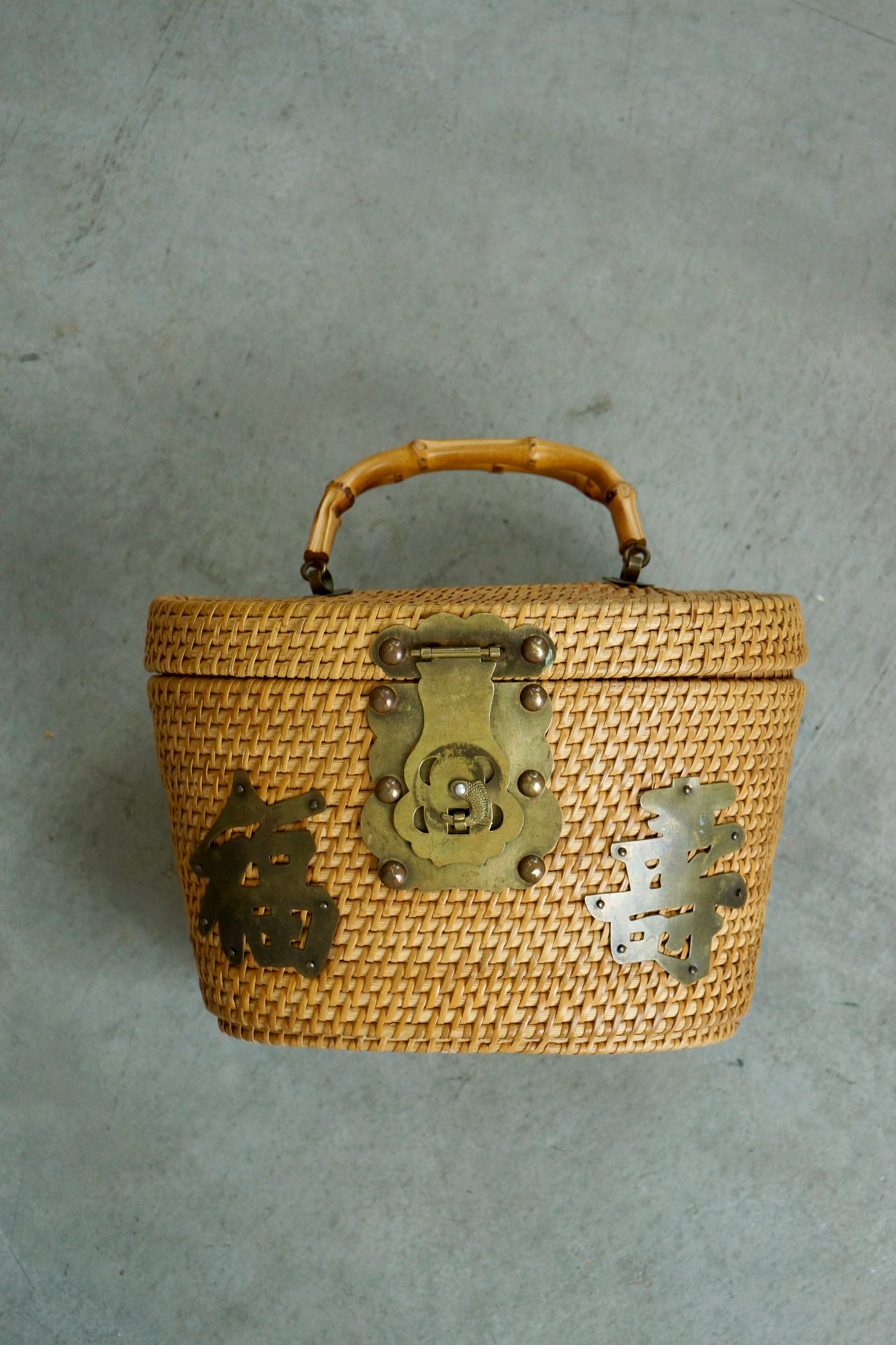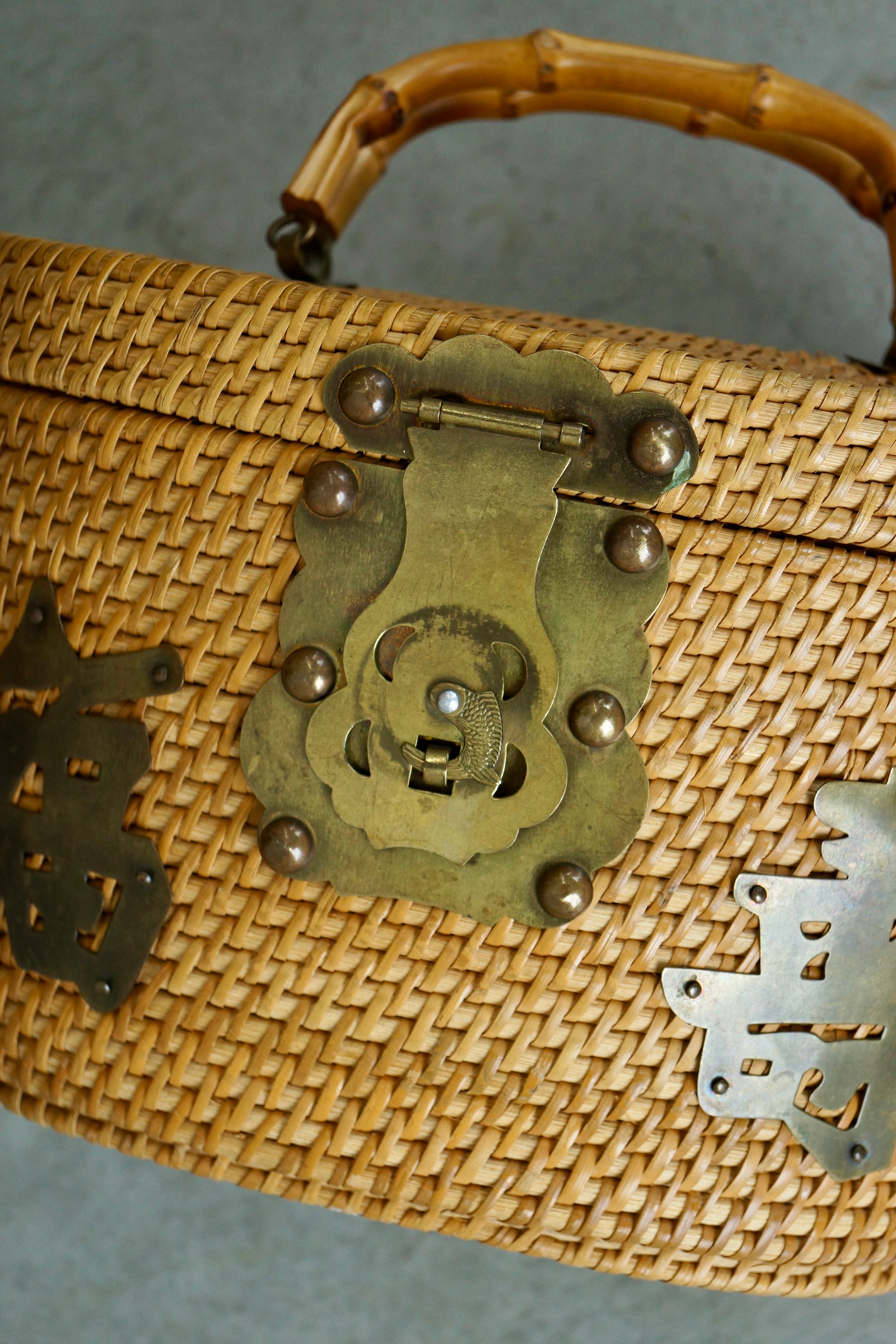A rare vintage gem from the 1970s, this structured basket bag features tightly woven rattan, ornate brass hardware, and traditional Chinese characters symbolizing good fortune and happiness. The hinged top opens with a decorative lock plate, while the curved bamboo handle adds an organic, sculptural touch. A striking mix of craft and culture, this piece carries history and elegance in every detail.