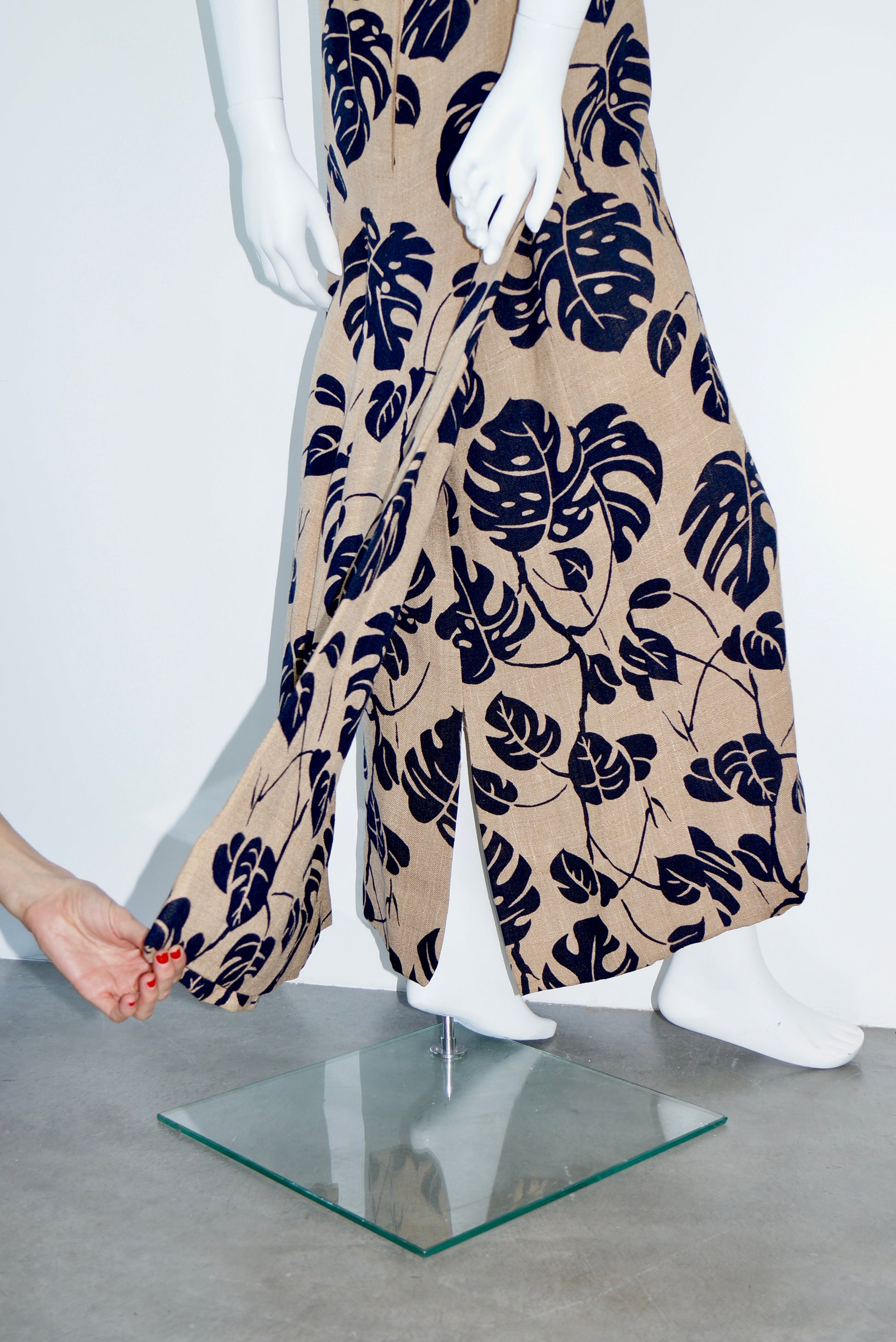 Circa 1970s. Christian Dior. High Neck Maxi Gown. Monstera Leaf Printed. Basket Woven Linen With Beautiful Train.