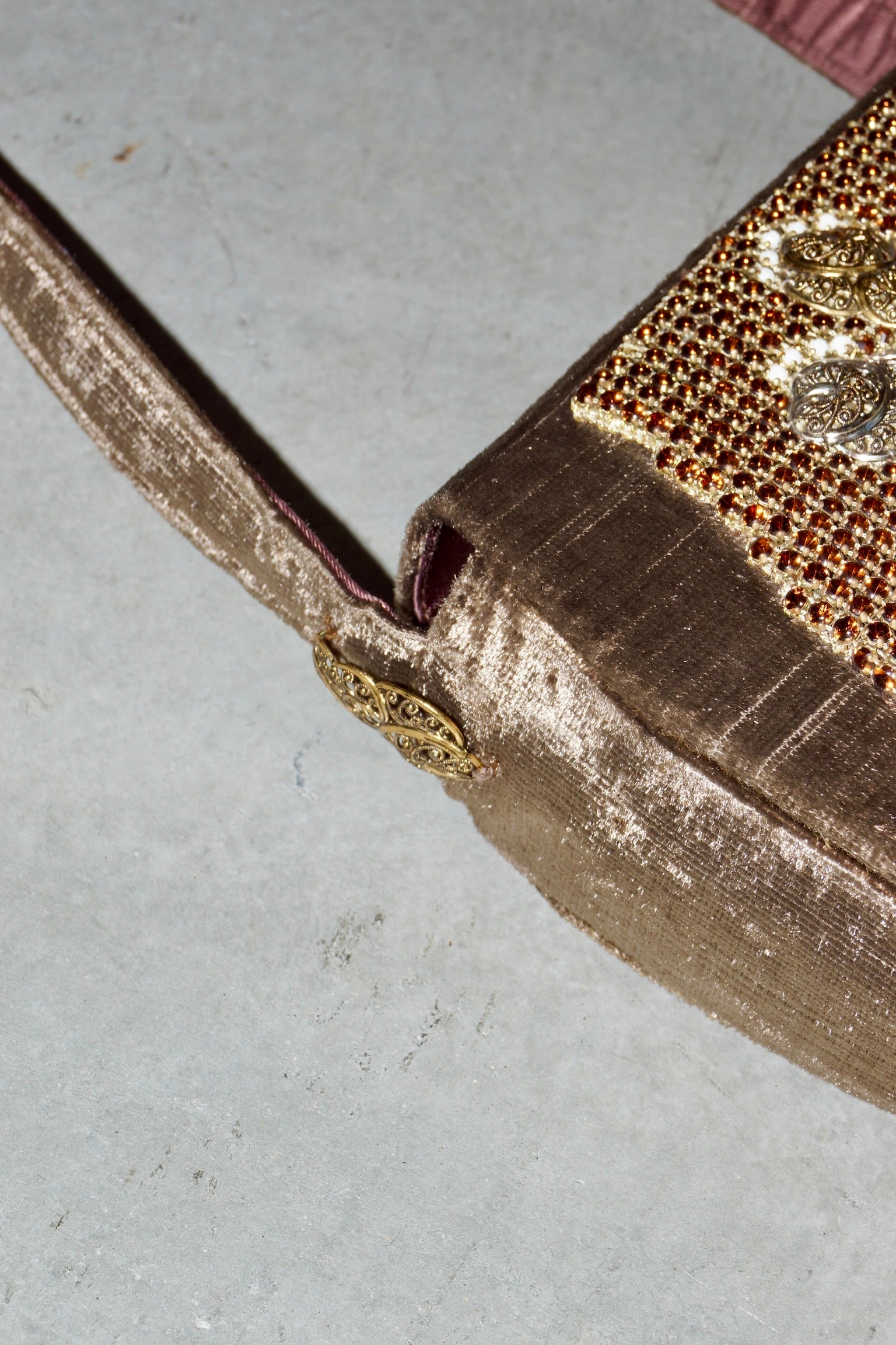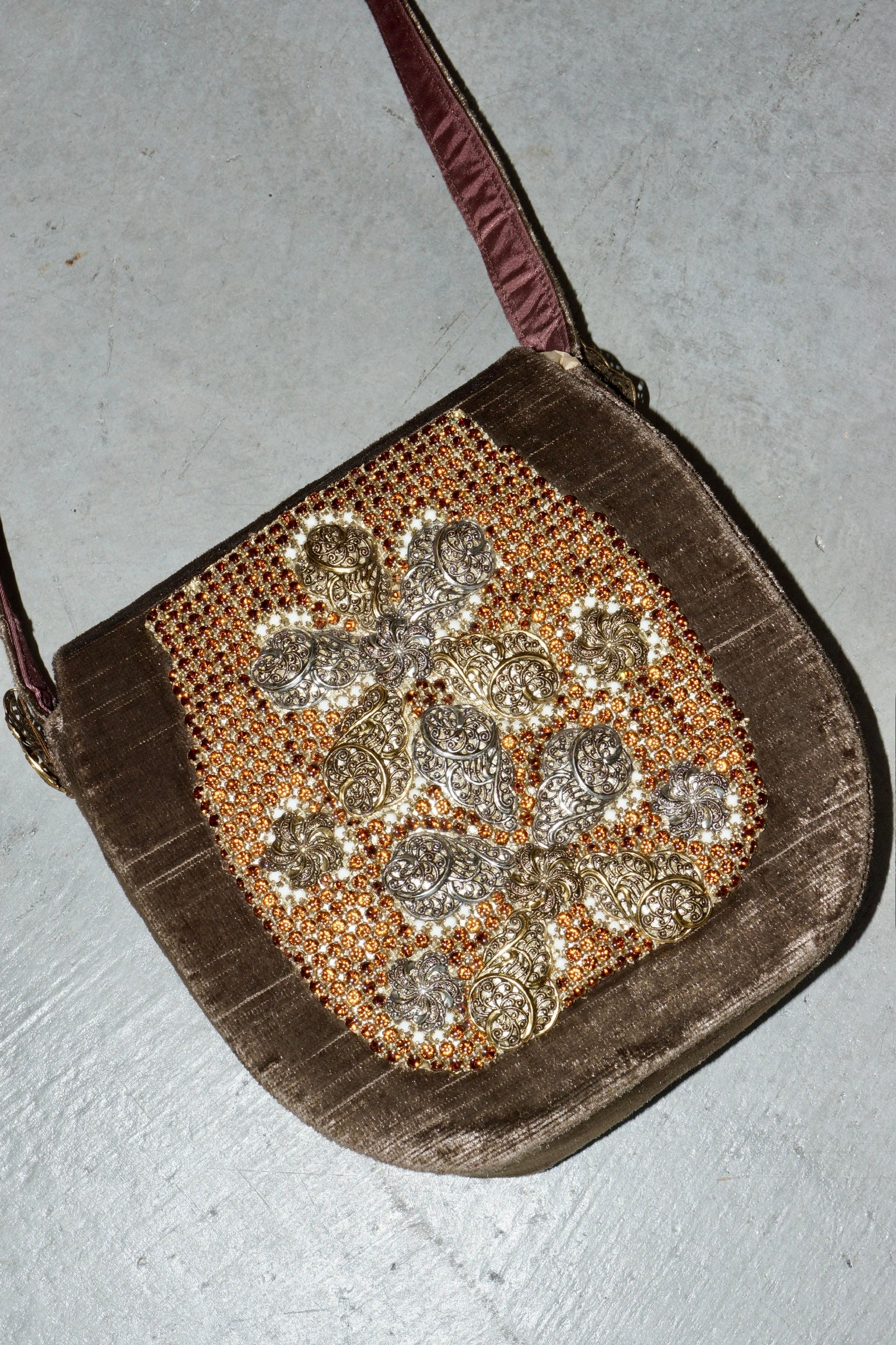 Framed by a softly structured suede body, the bag balances richness with everyday ease, while the long shoulder strap allows it to be worn comfortably crossbody. Warm earth tones and intricate surface work make this piece feel collected rather than trendy, an accessory that adds depth and character to even the simplest look.