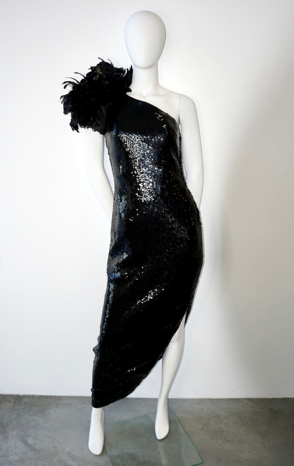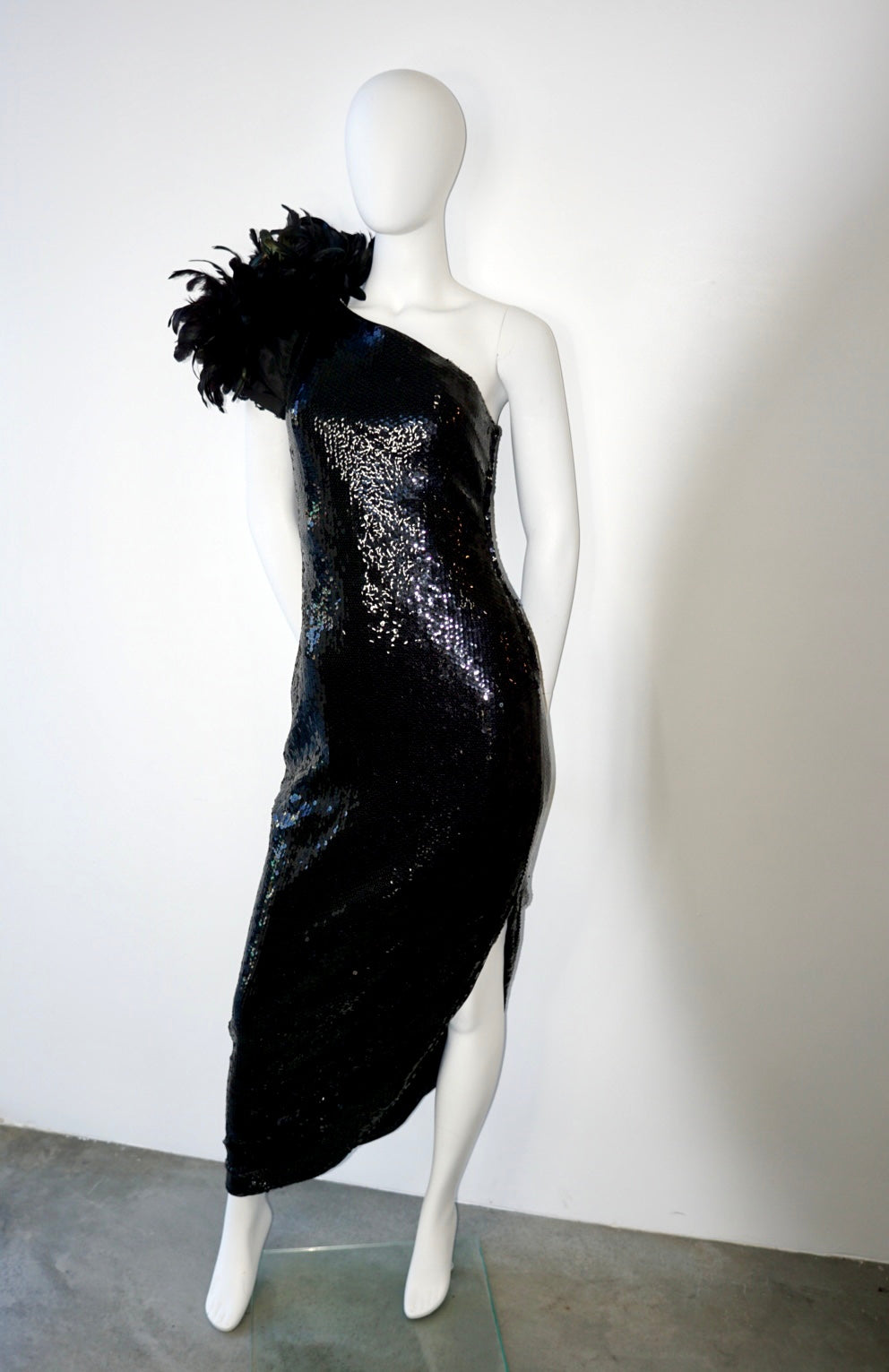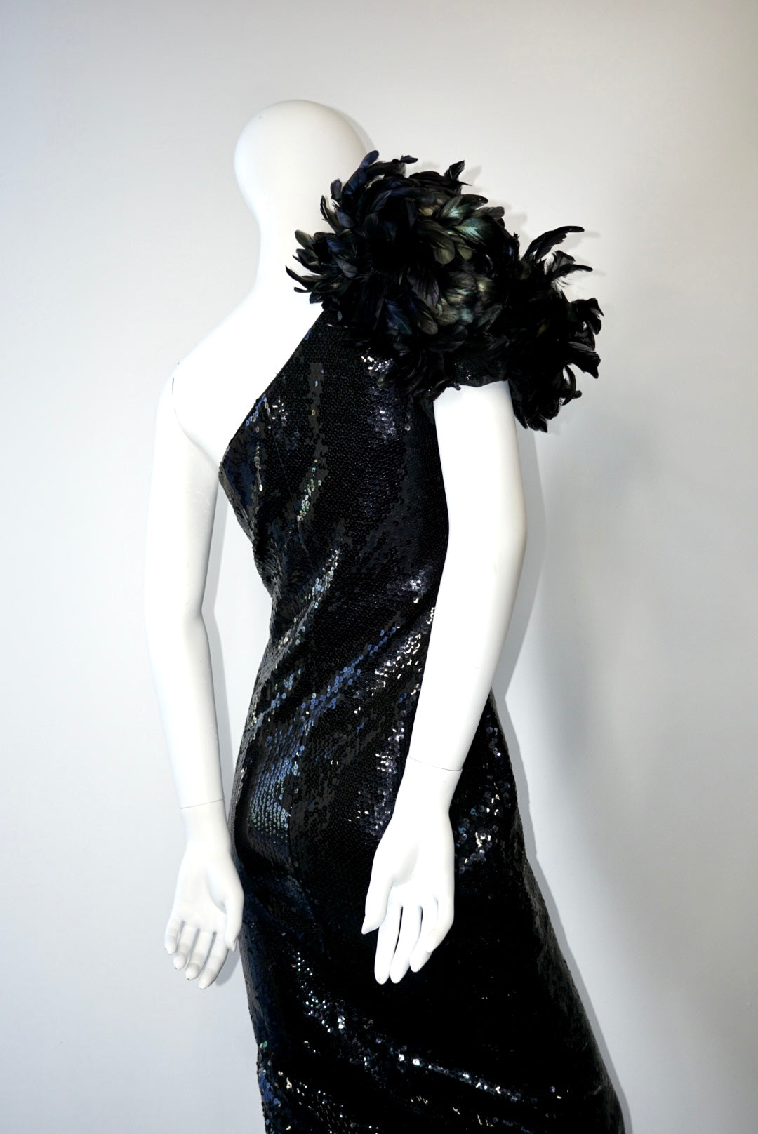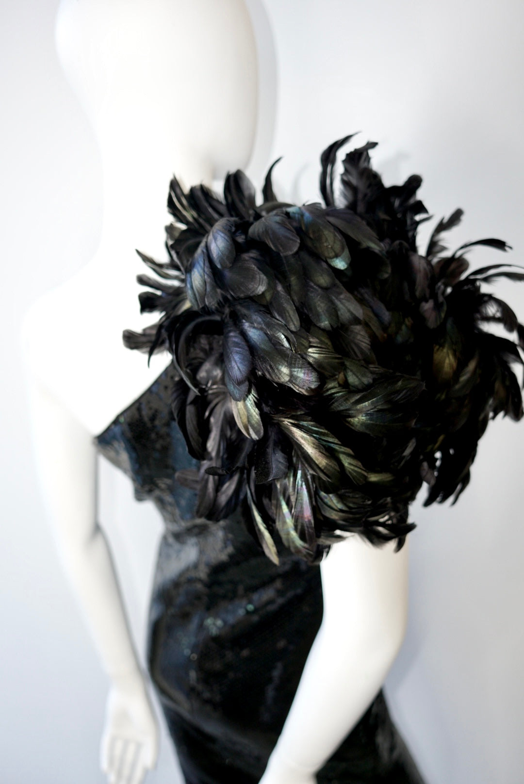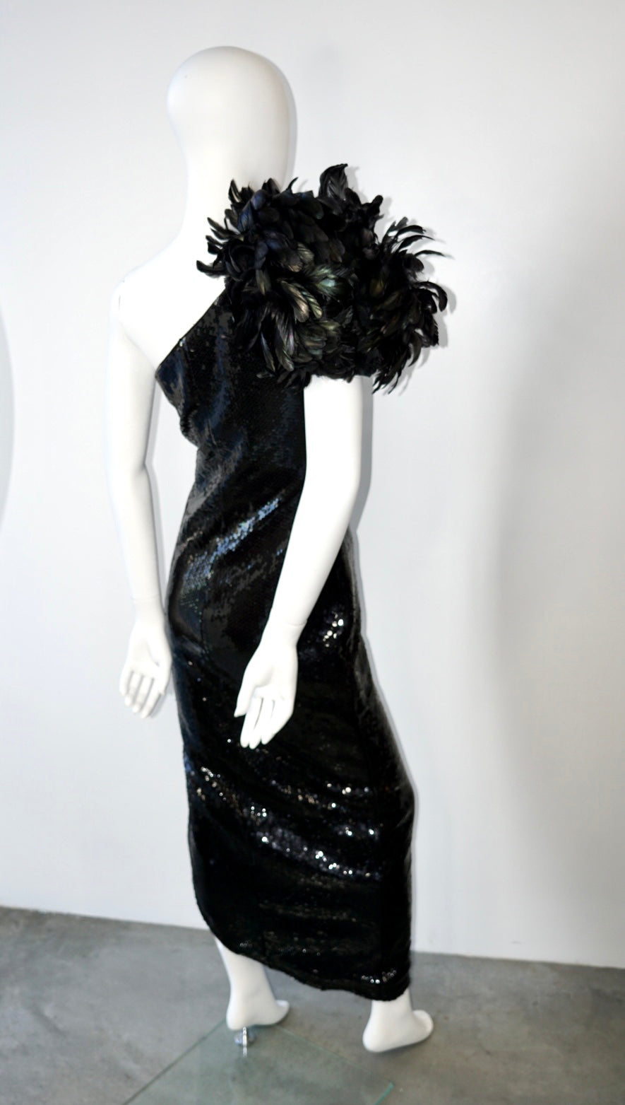 1980's After Five by Julie Duroche black sequin one-shoulder gown with black iridescent feathers on shoulder. Asymmetrical hemline, lined on the inside, and a zipper up the side. This dress is made for a very special evening. Union made.