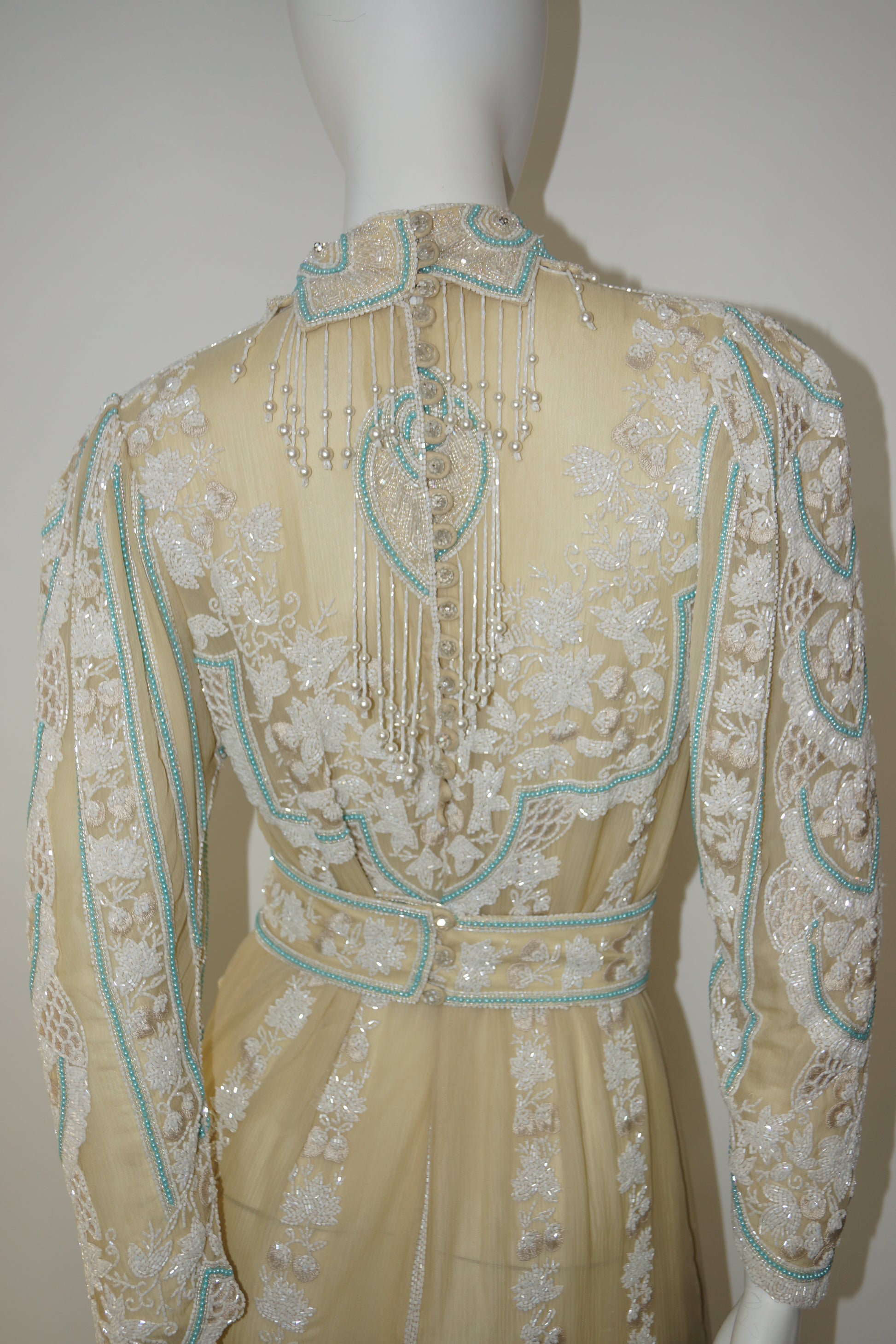 Turquoise beaded detailing traces the seams and architectural panels, highlighting the dress’s sculptural construction while adding a subtle note of color and contrast. The high neckline and long sleeves create a refined, almost ceremonial silhouette, balanced by the softness of the sheer layers and ornate surface work.