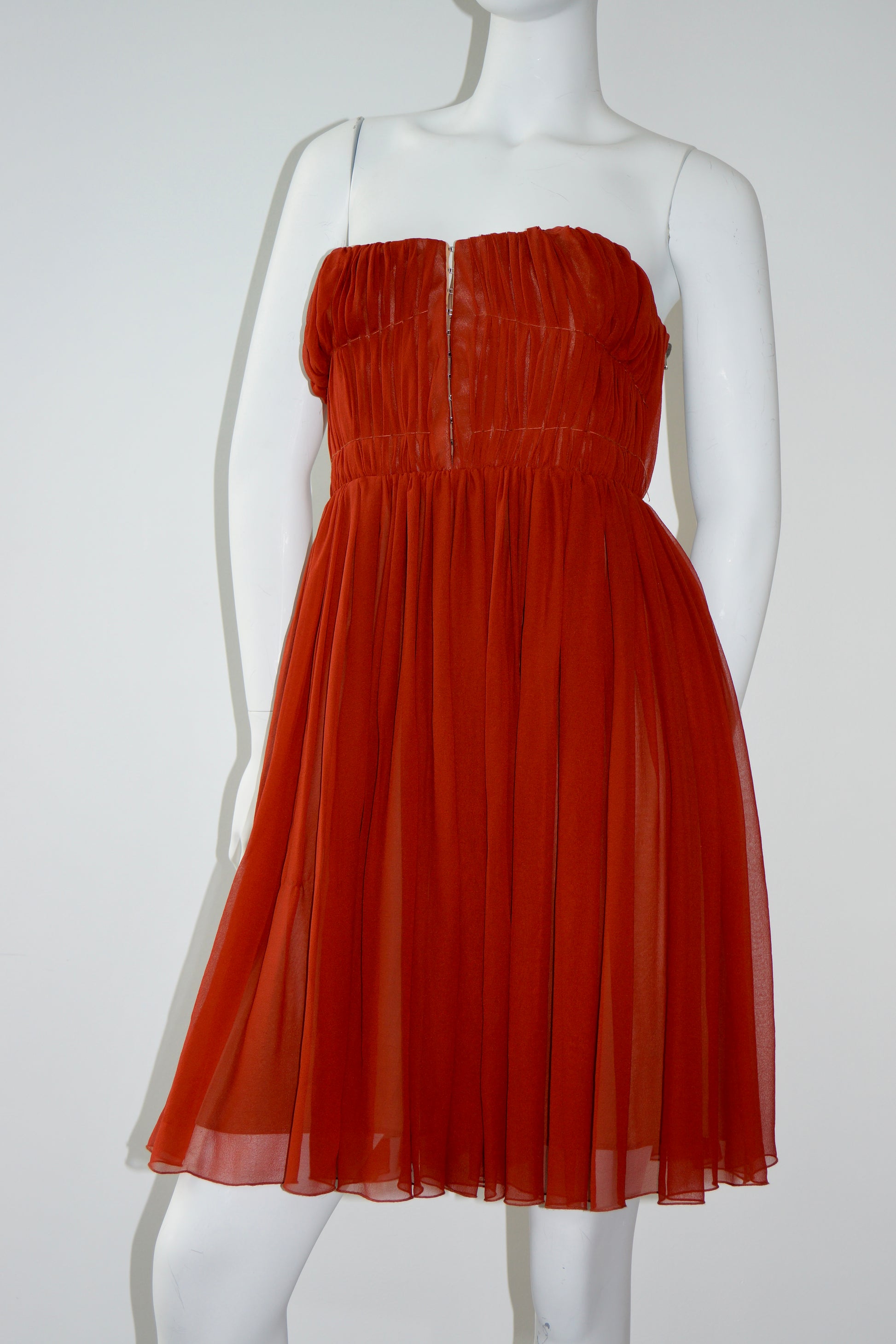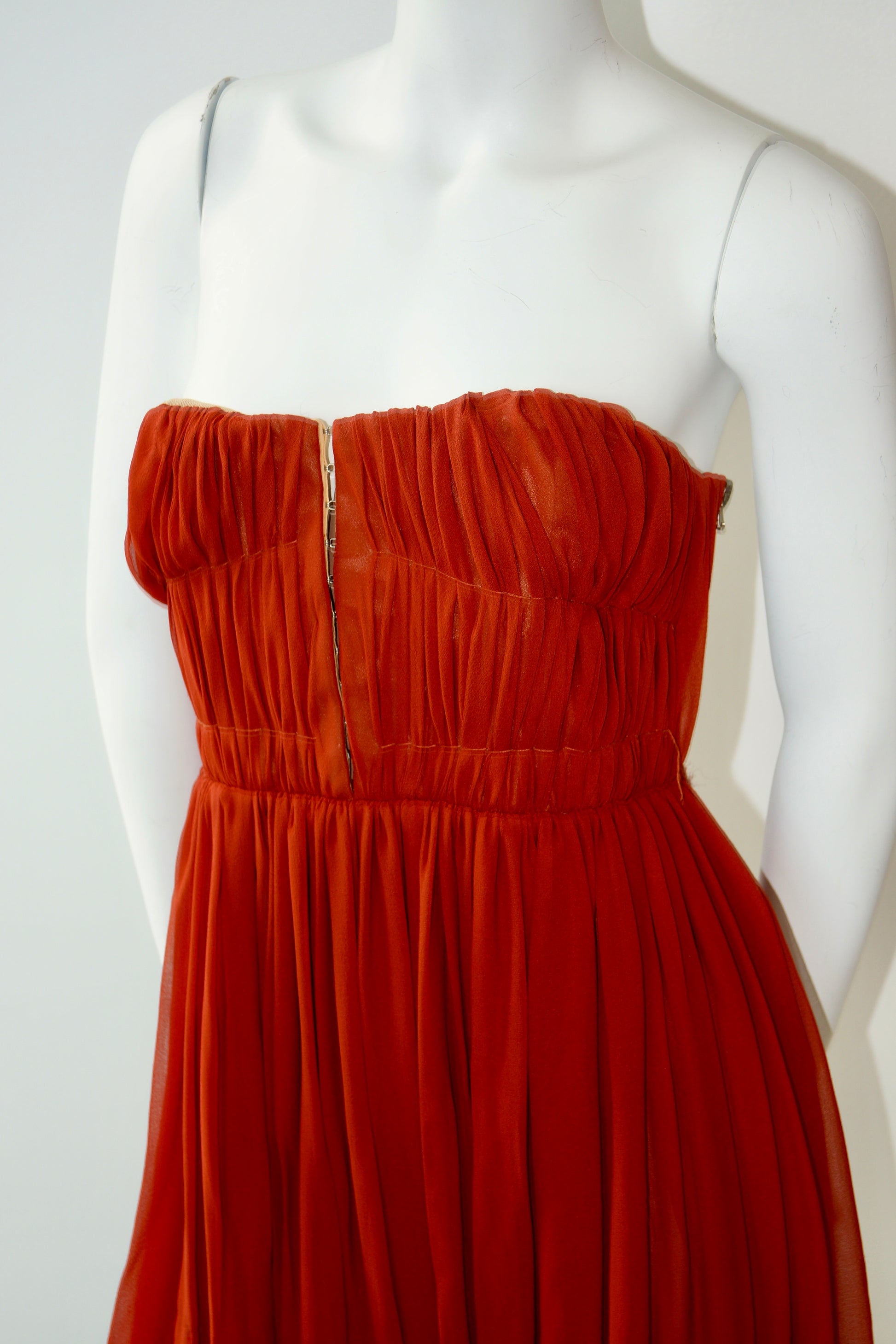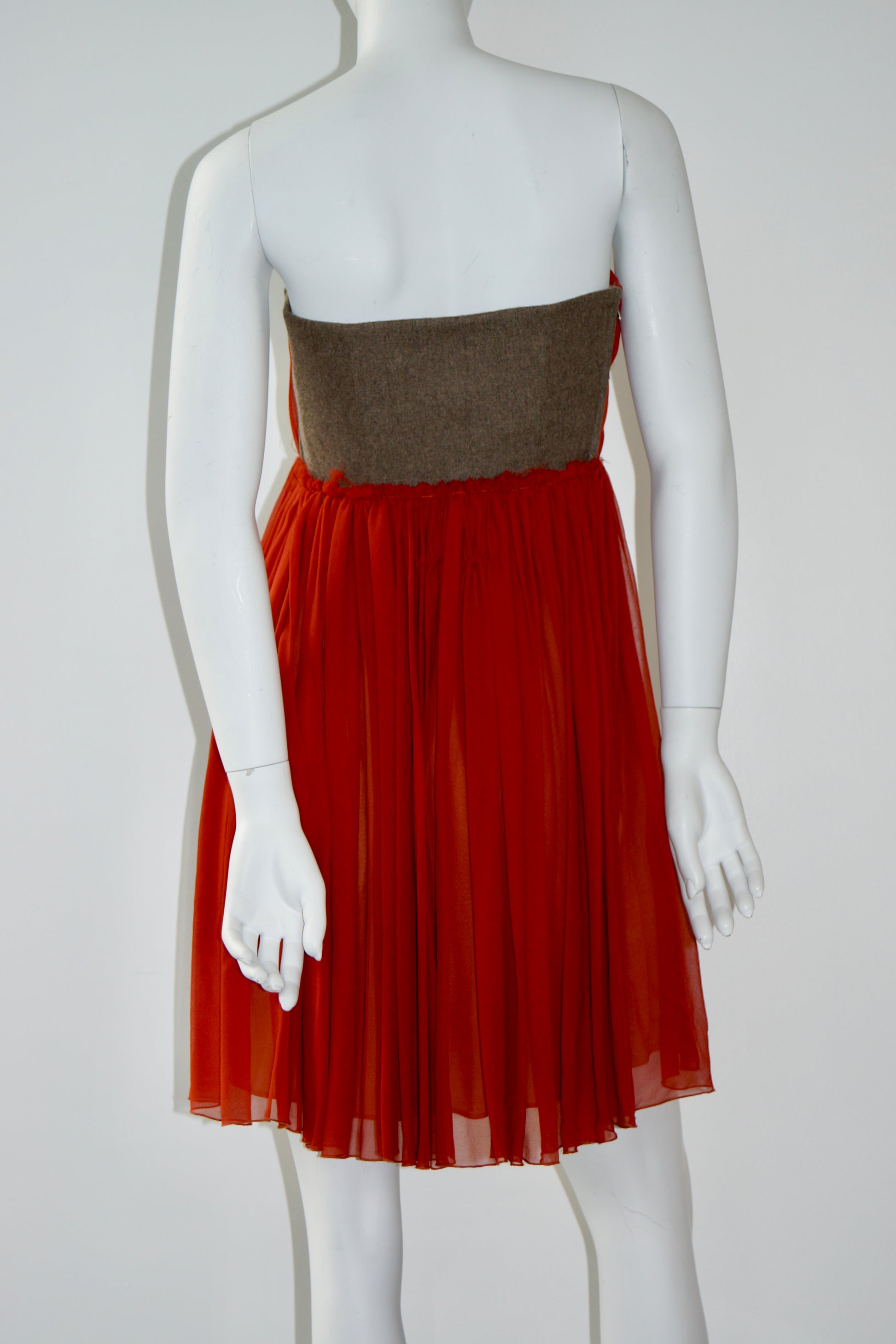 Carven dress stuns in rust-red silk chiffon. The strapless silhouette features delicate ruching through the bodice, a subtle front slit with hidden hook closures, and a softly gathered skirt that moves with you. Fully lined with an easy zip back. And grey wool upper back.