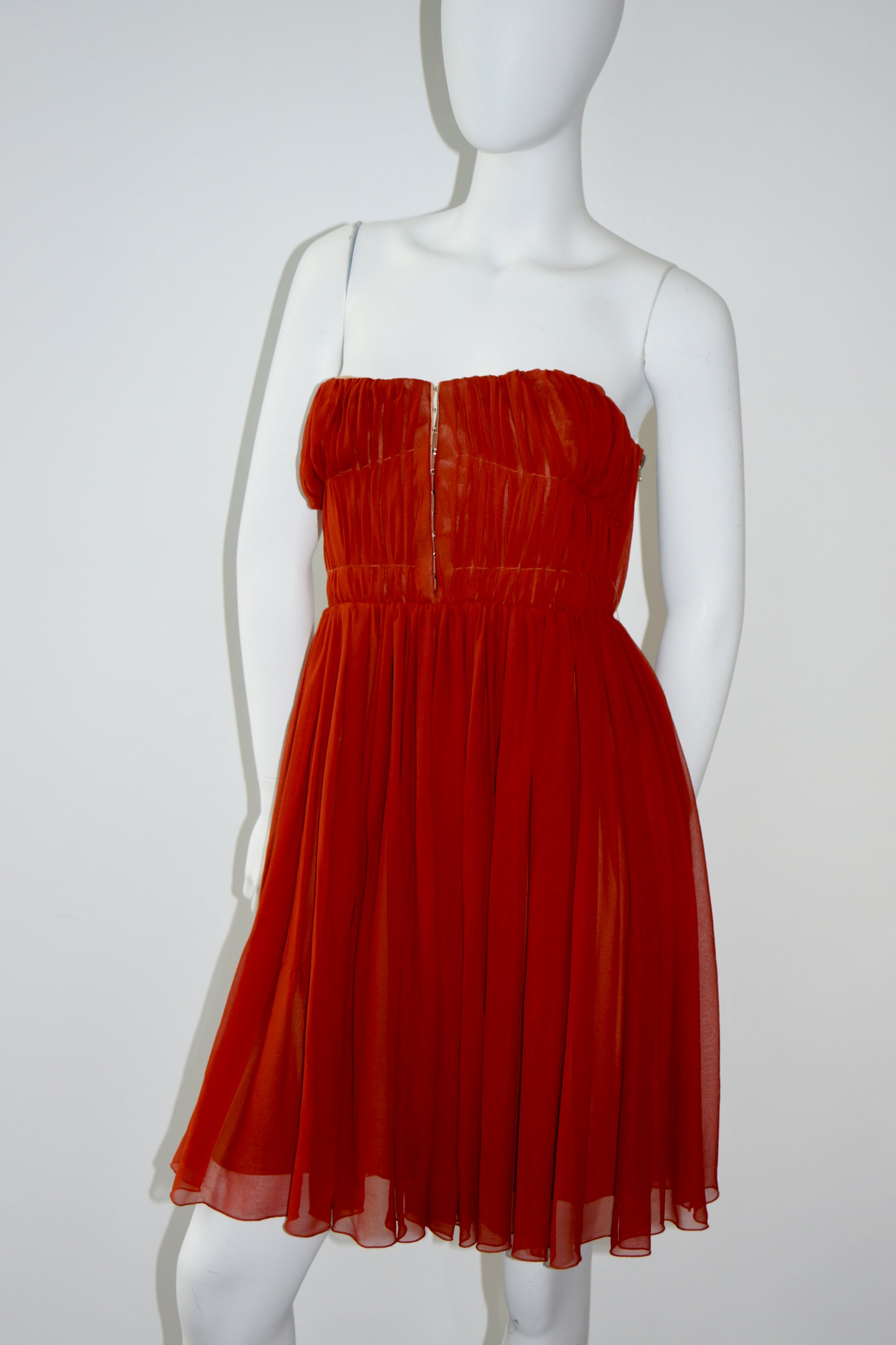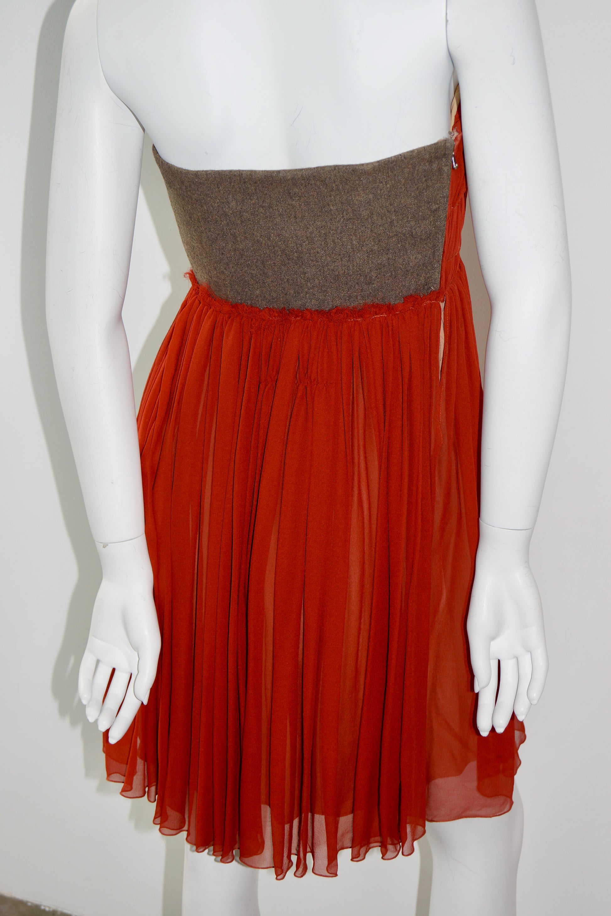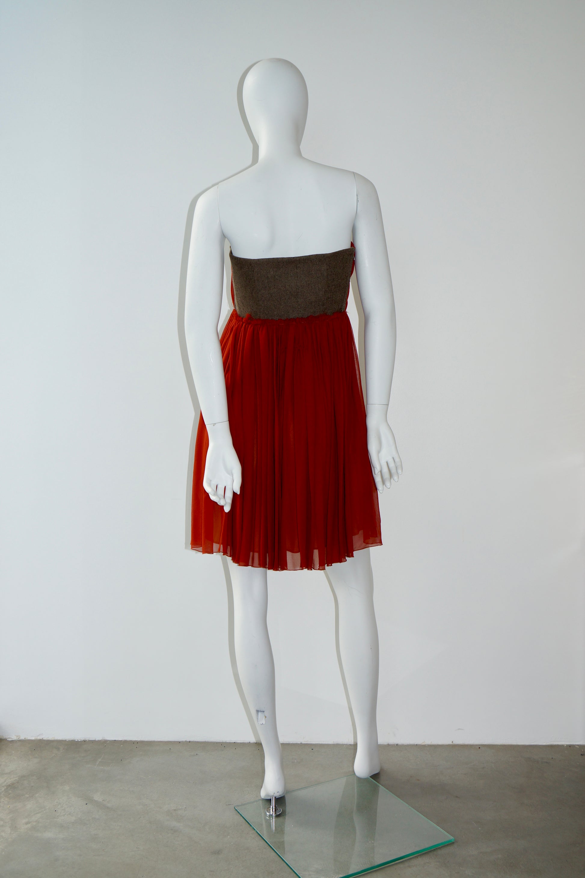 Carven dress stuns in rust-red silk chiffon. The strapless silhouette features delicate ruching through the bodice, a subtle front slit with hidden hook closures, and a softly gathered skirt that moves with you. Fully lined with an easy zip back. And grey wool upper back.
