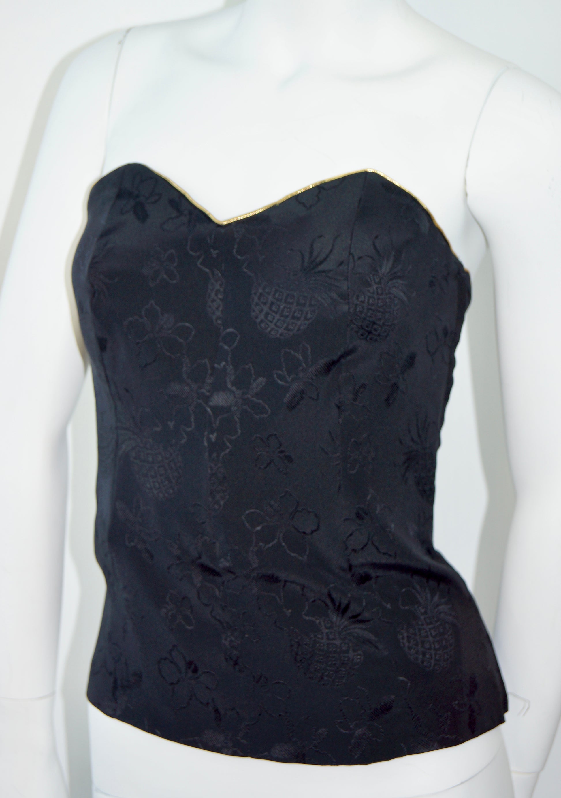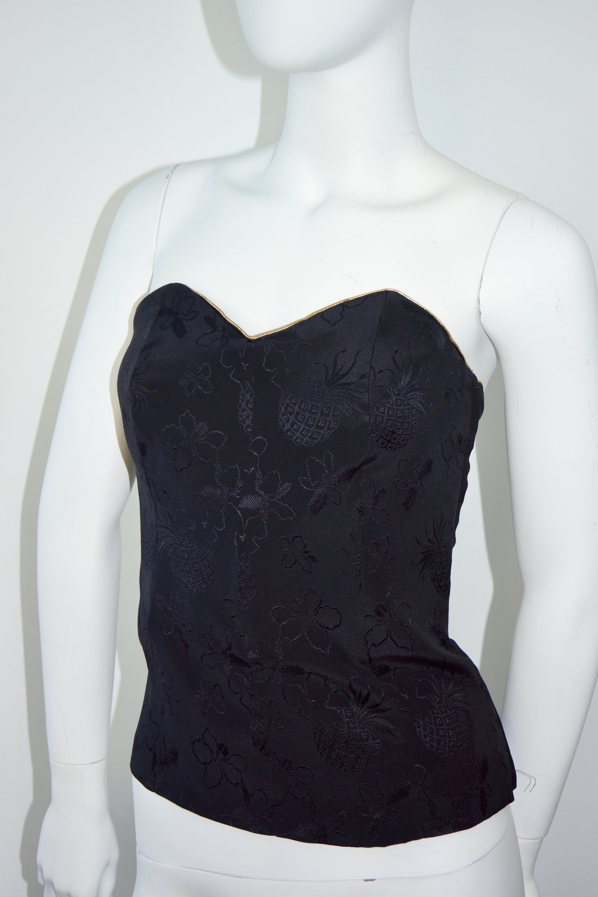 Exude sophisticated allure in this Emanuel Ungaro silk bustier top. The rich black silk fabric boasts a beautiful texture with a subtle, woven design of pineapples and flowers. The classic sweetheart neckline is finished with a refined gold piping trim, enhancing its feminine appeal. Boning on both sides. This structured and supportive top is a luxurious statement piece from a celebrated Italian designer.