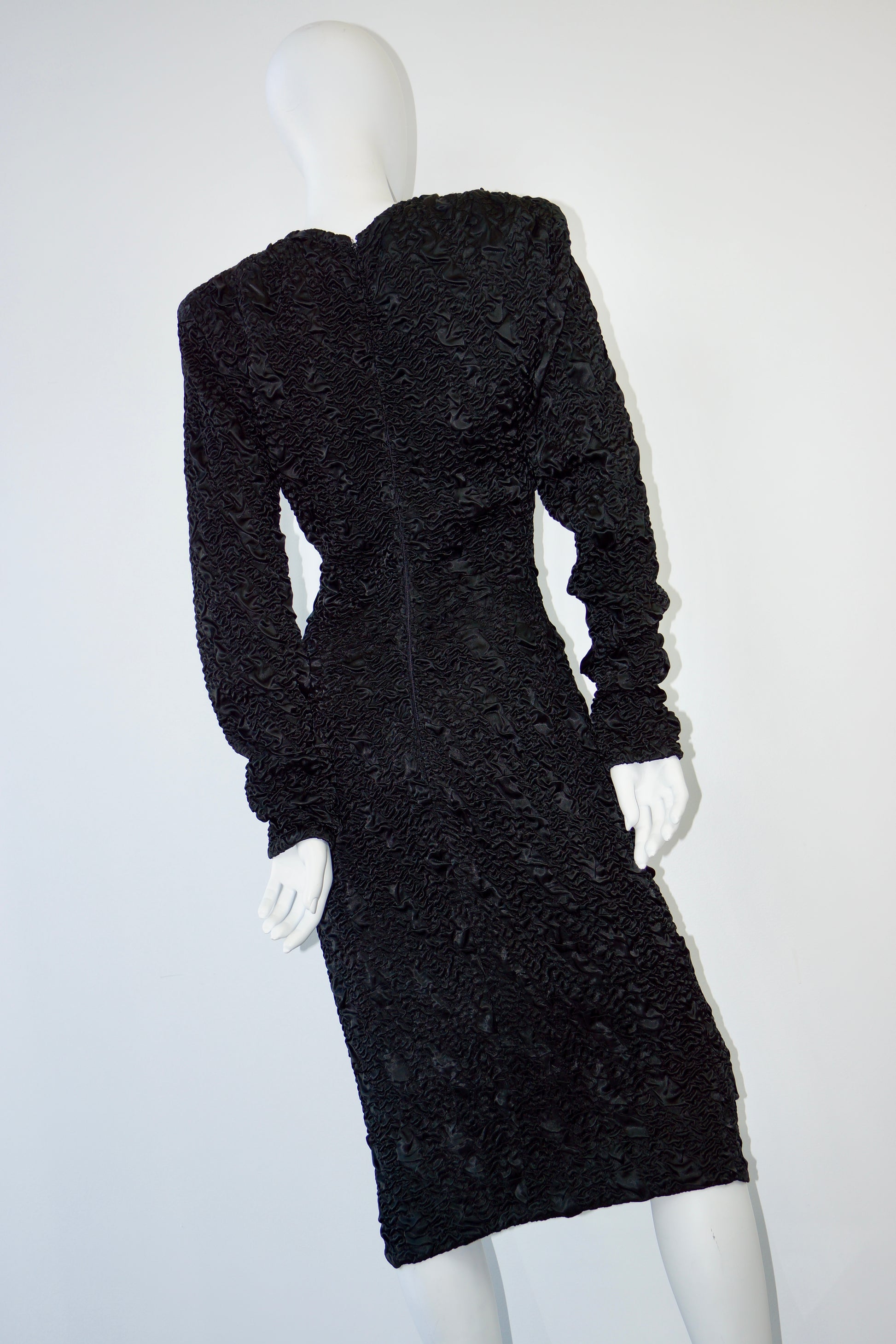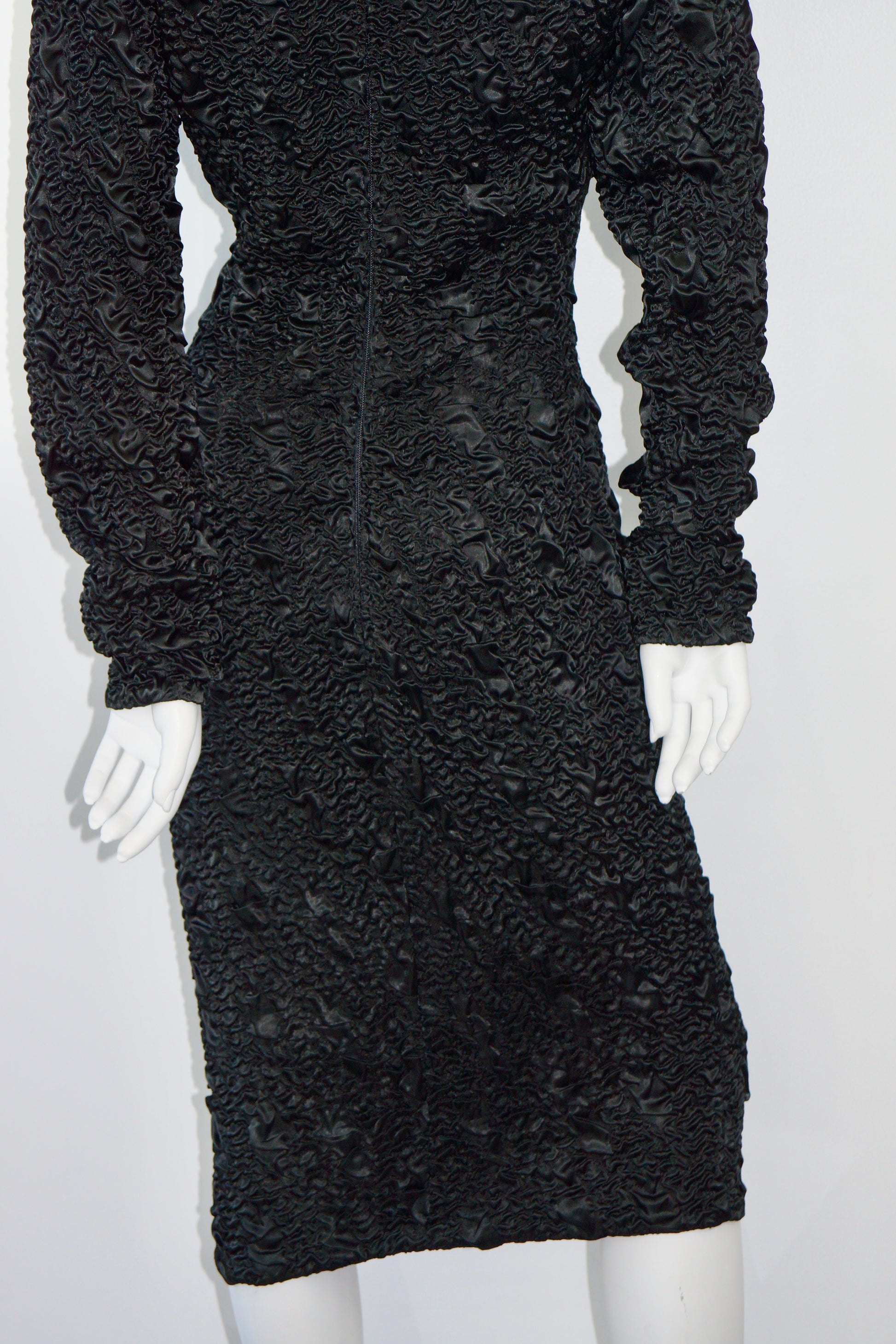 Make a statement in this striking Gianni Versace black cocktail dress. Crafted in a unique satin matelassé fabric, the raised, textured surface creates a visually captivating effect. The dress features a classic fitted sheath silhouette that falls to approximately below knee-length, a refined round neckline, and long, fitted sleeves that may feature subtle gathering. This piece embodies the bold and luxurious aesthetic of Gianni Versace. Zips up the back. Silk, viscose, & nylon blend.