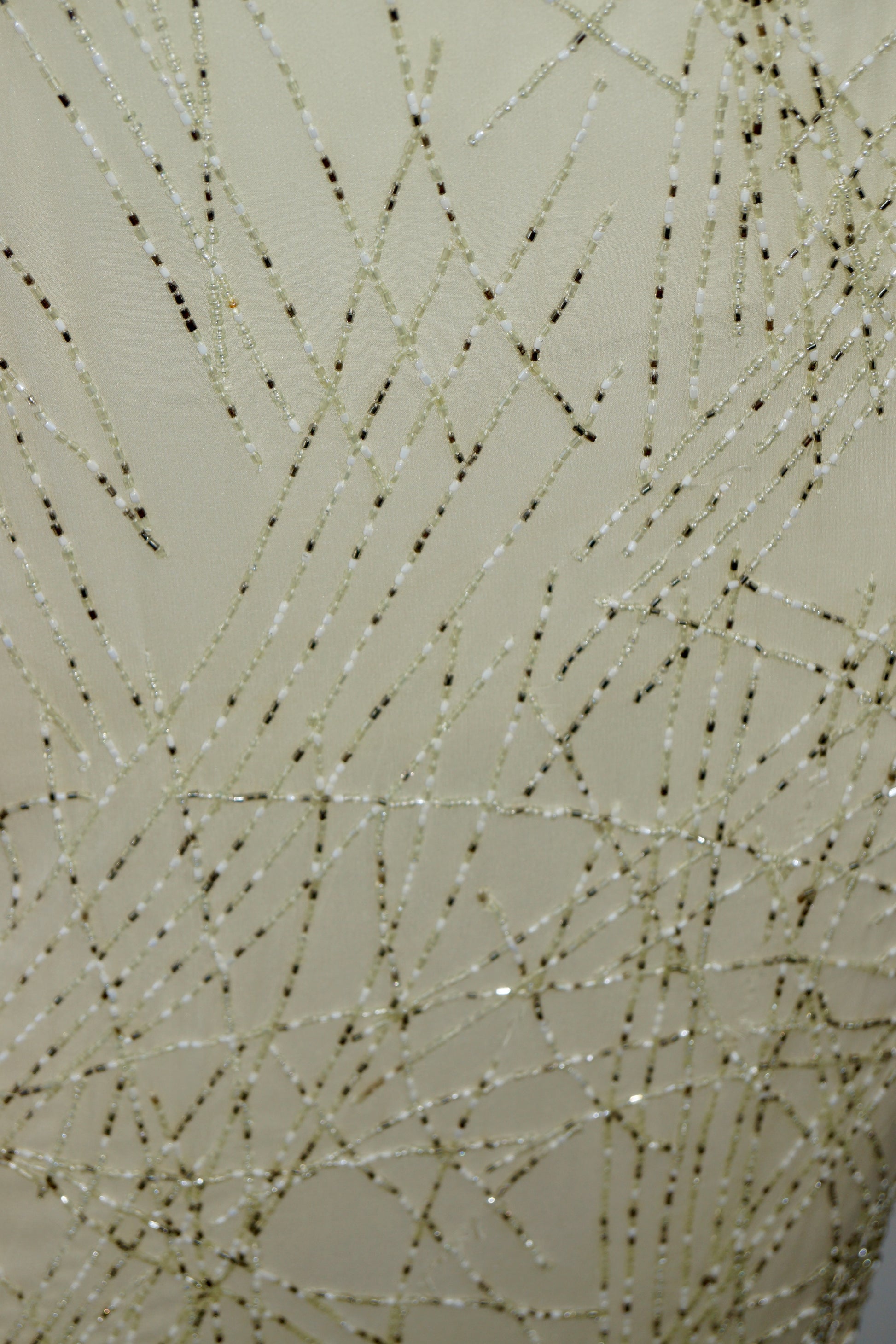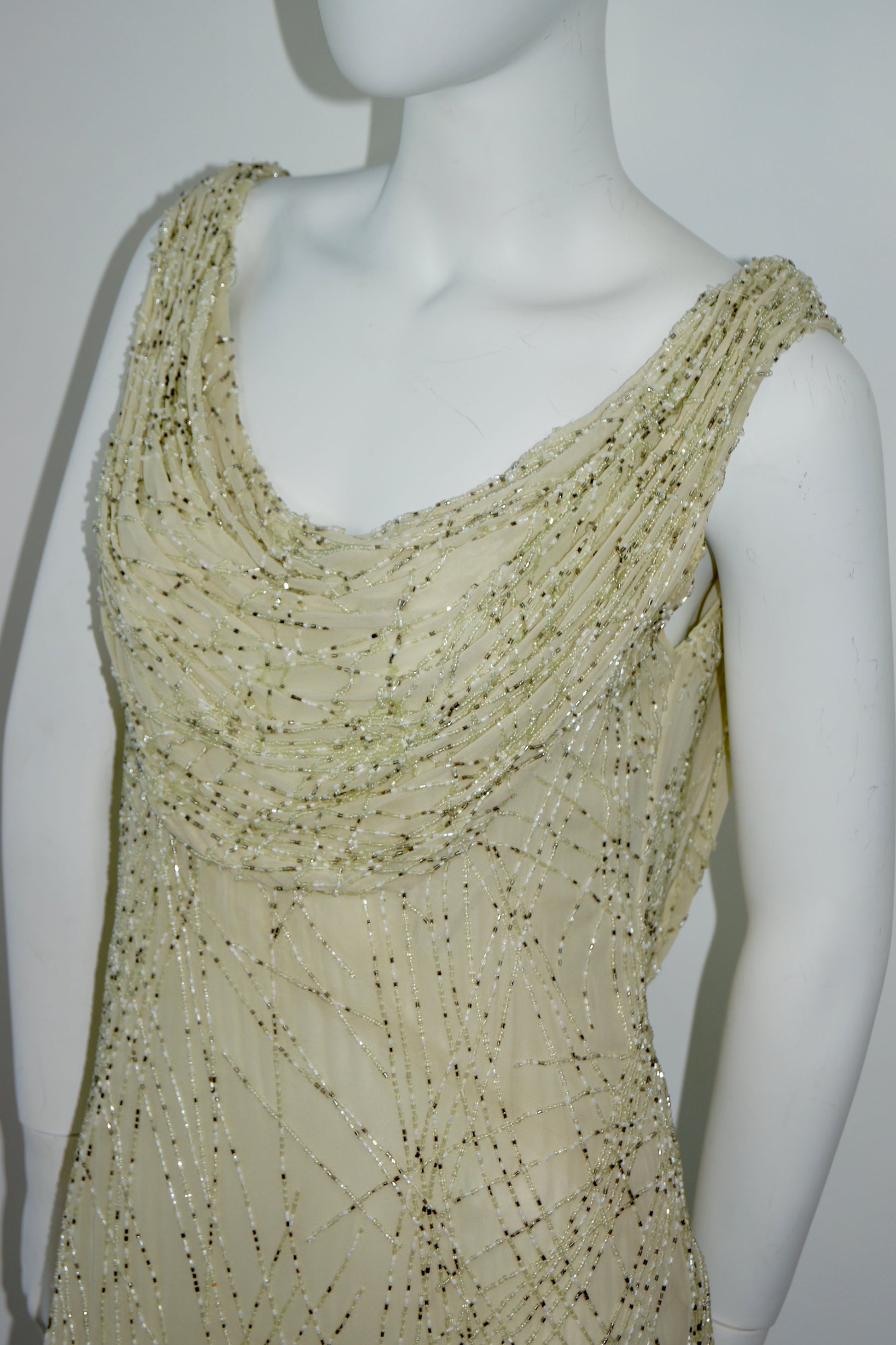 Delicate beadwork forms an abstract, almost celestial pattern throughout the gown, adding depth and quiet drama without overpowering its refined simplicity. Skimming the body with a graceful column shape, this piece is designed to elongate and flatter, evoking the glamour of old-world ateliers and evening salons.