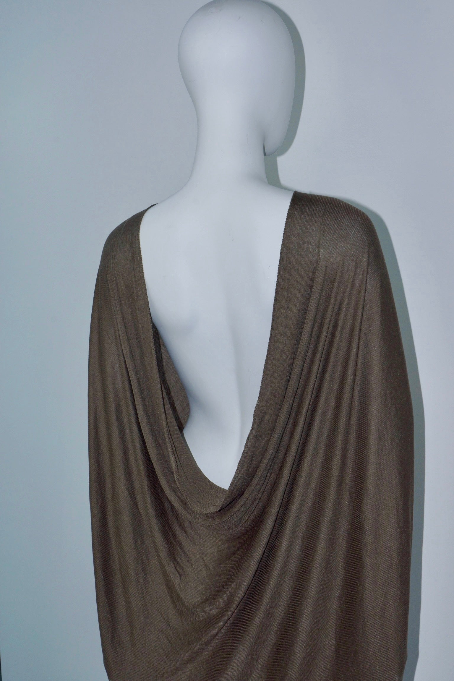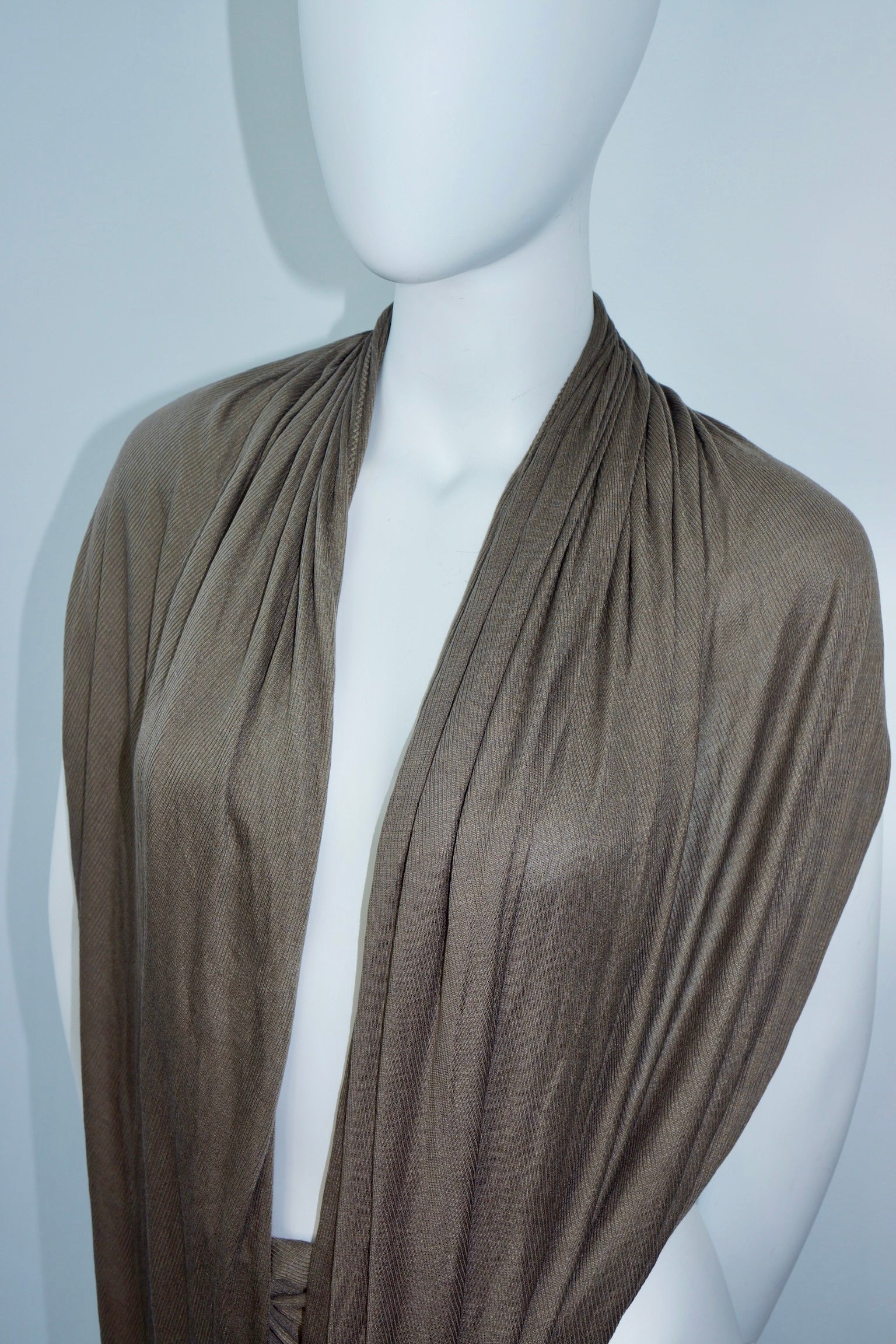 Experience the fluid elegance of this Italian wrap shawl or top. Crafted in a soft, draping rich stone color, jersey knit, silk blend, this piece features a central twist that creates a flattering V-neckline and an open front. Wear it as a chic shawl or creatively style it as a unique top by wrapping and tying the flowing fabric. A versatile addition to any wardrobe, offering effortless sophistication.