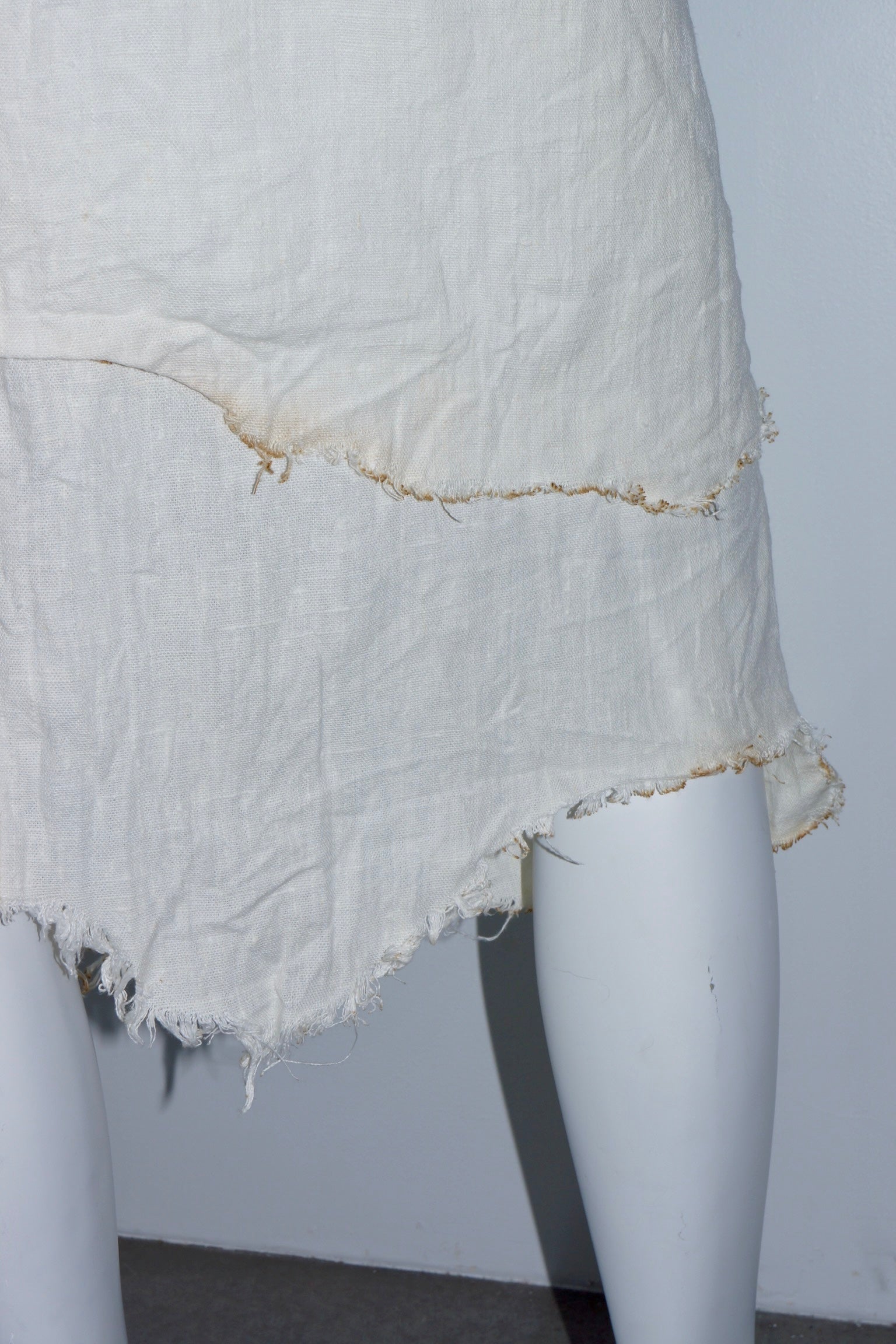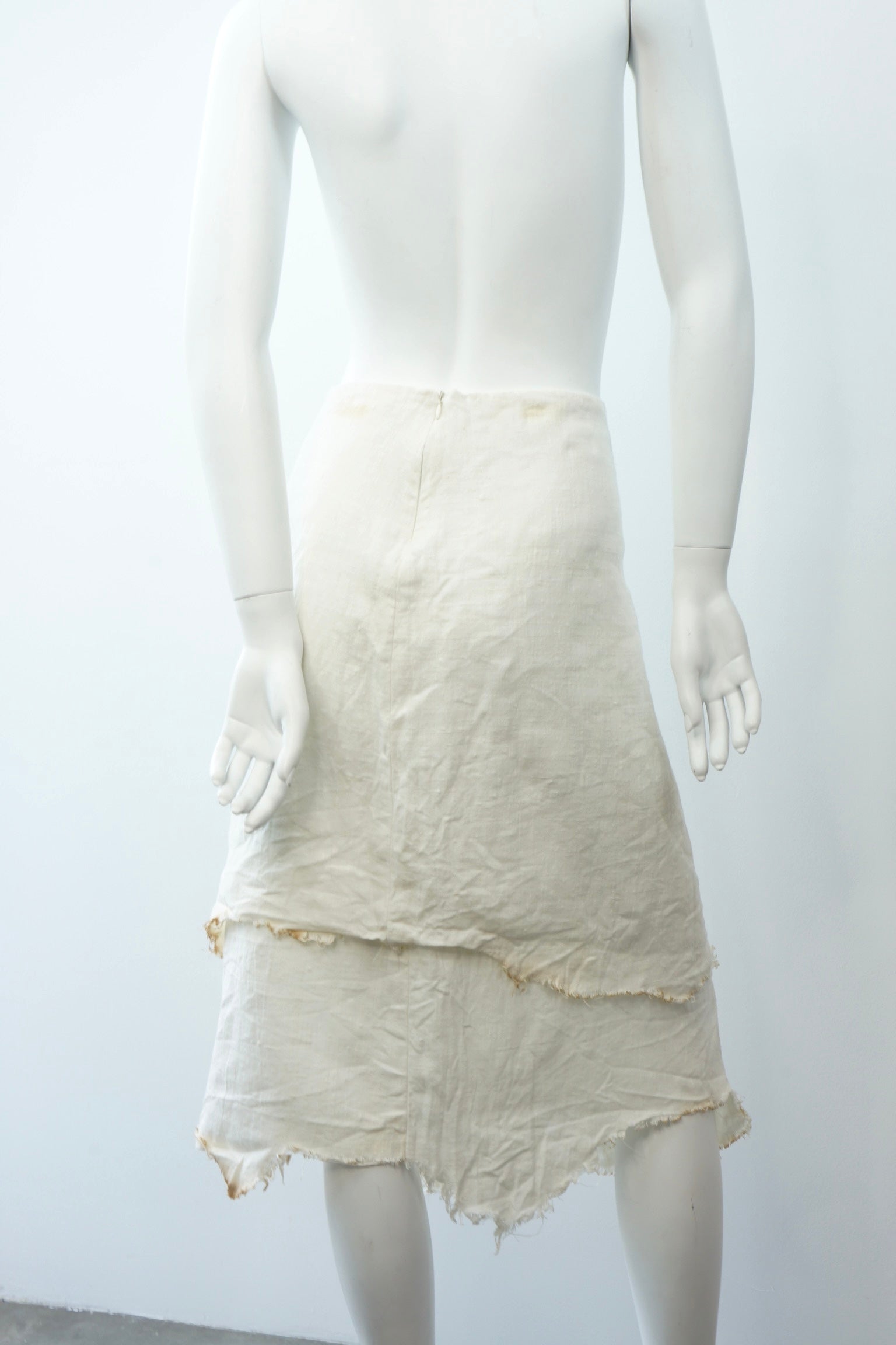 Embrace avant-garde style with this unique dead stock y2k E.Play Italian-made skirt. Crafted in a light cream linen, this piece features a layered design with a dramatically distressed longer layer underneath. The irregular, jagged burnt edges and intentional holes create a bold, artistic statement. Side zipper. A distinctive piece for those who appreciate unconventional fashion. An excellent design inspiration piece. It reminds me of Margiela and a Corinne Day photo.