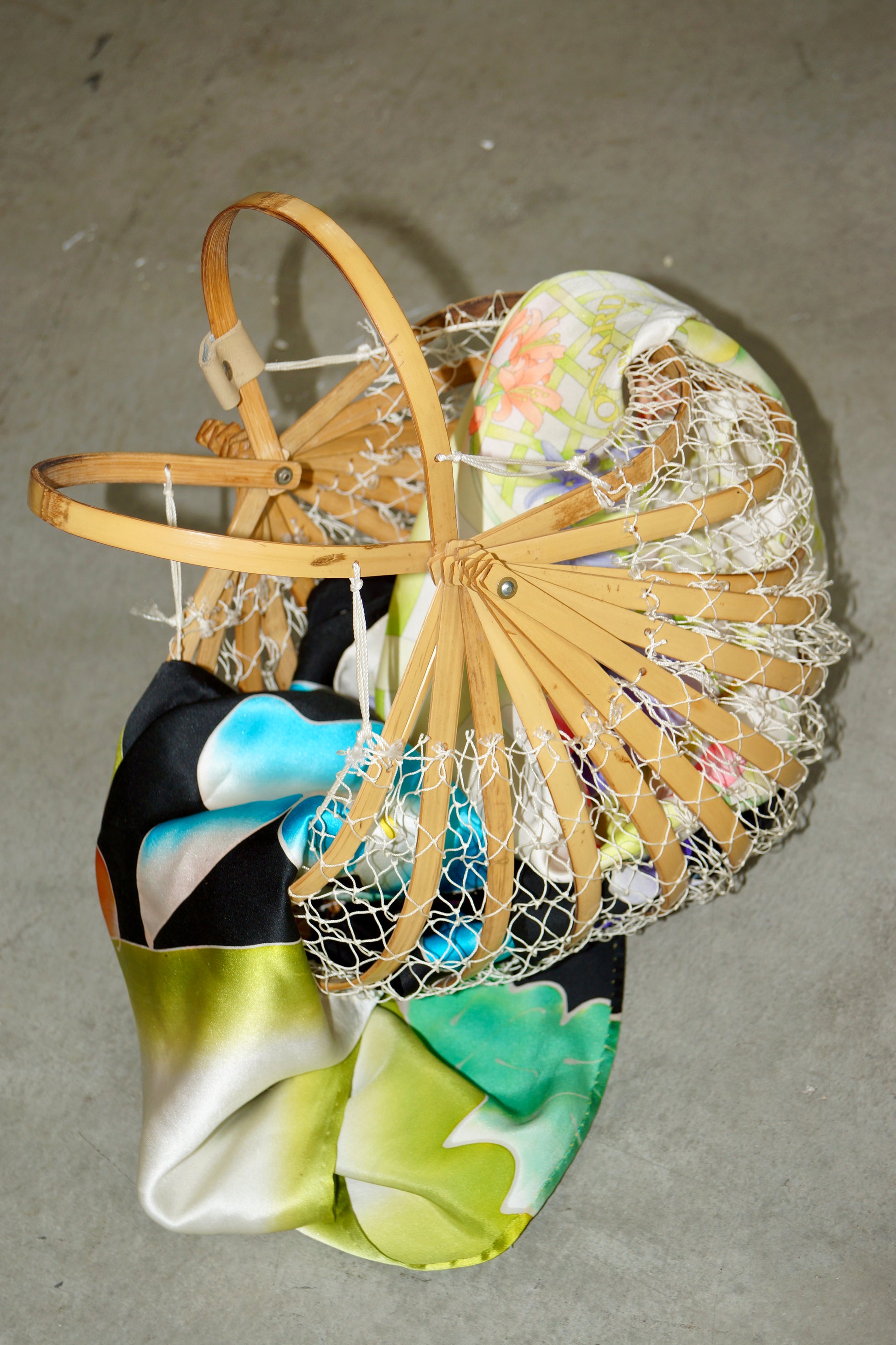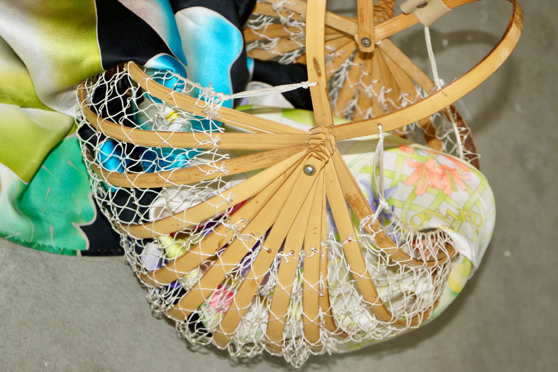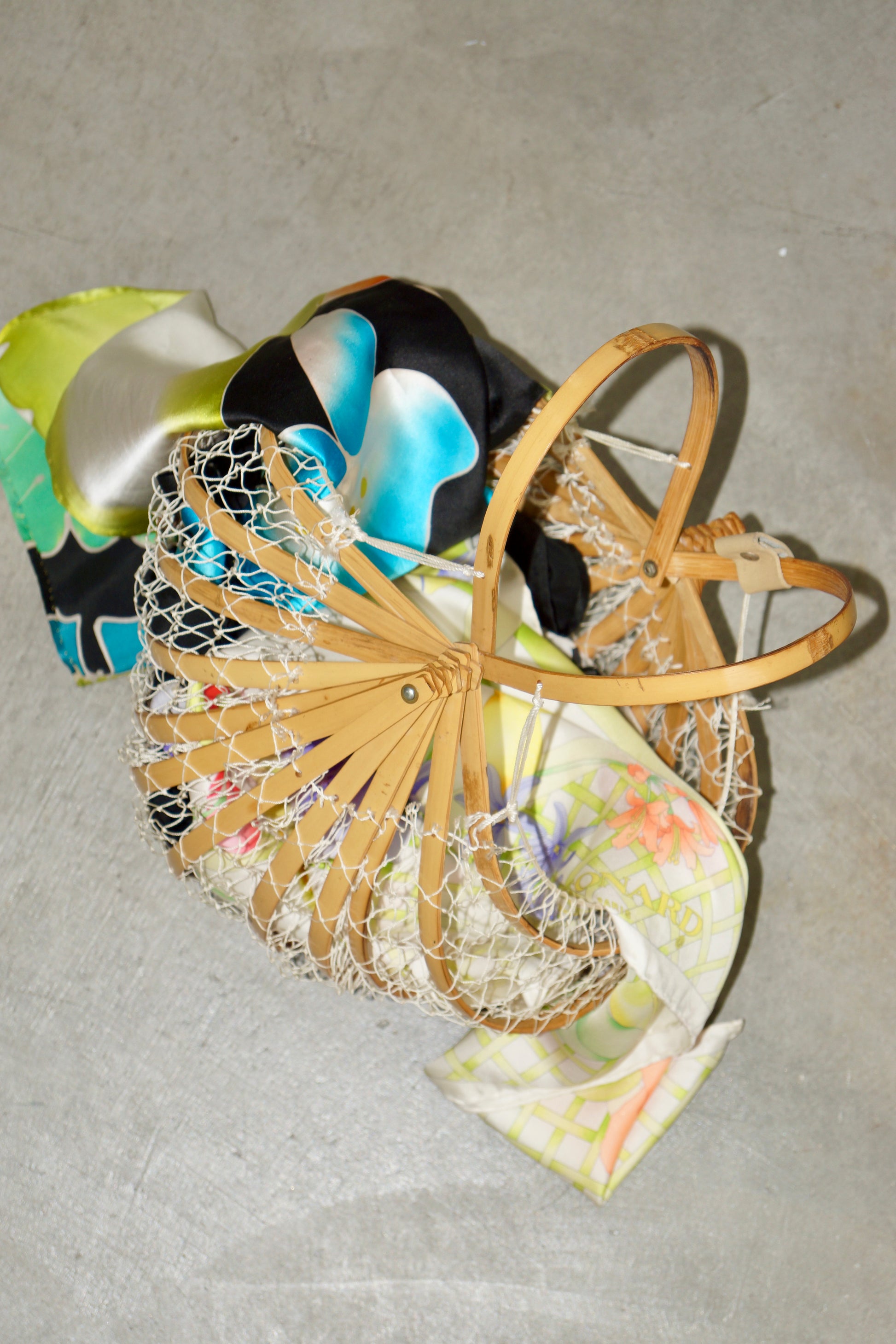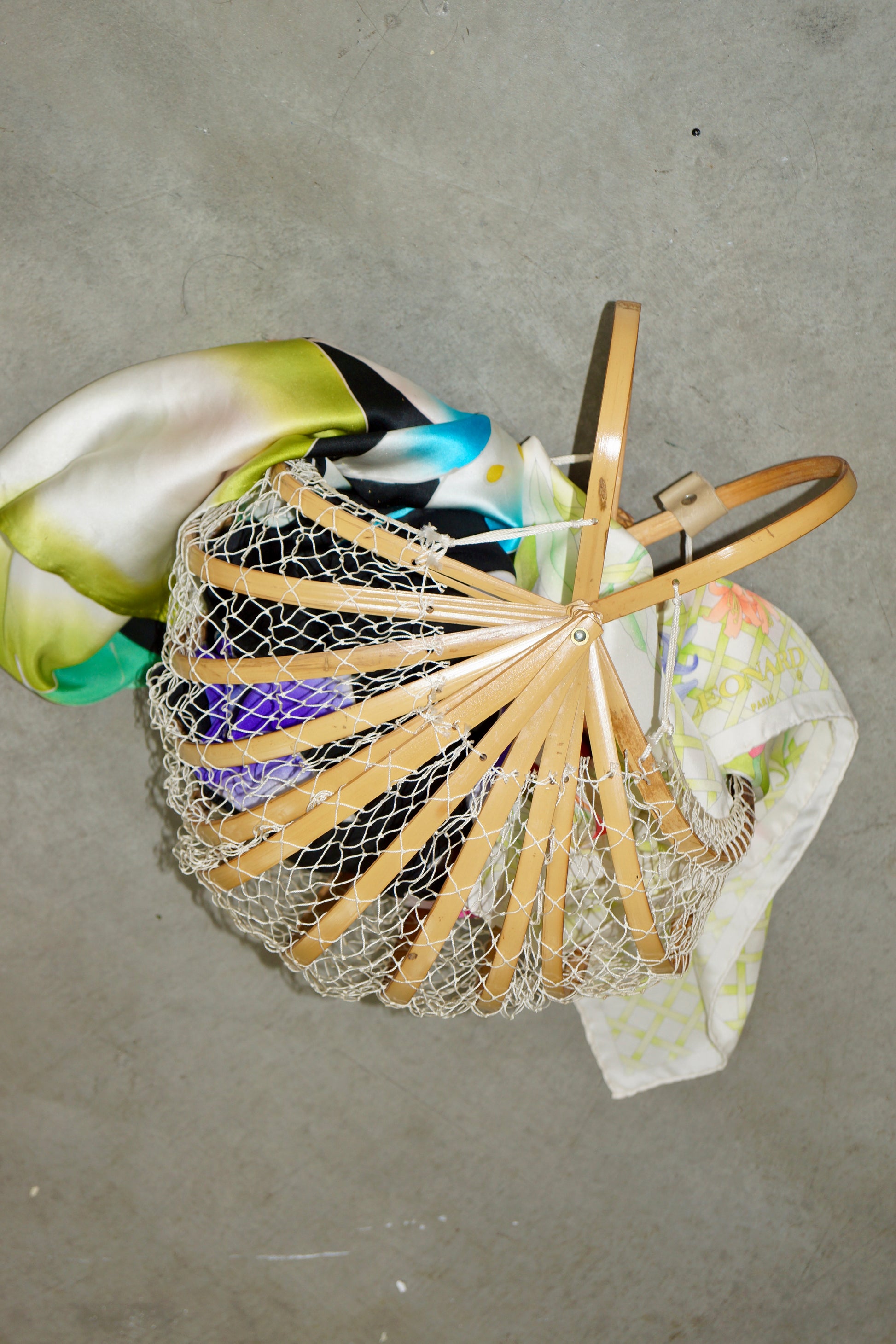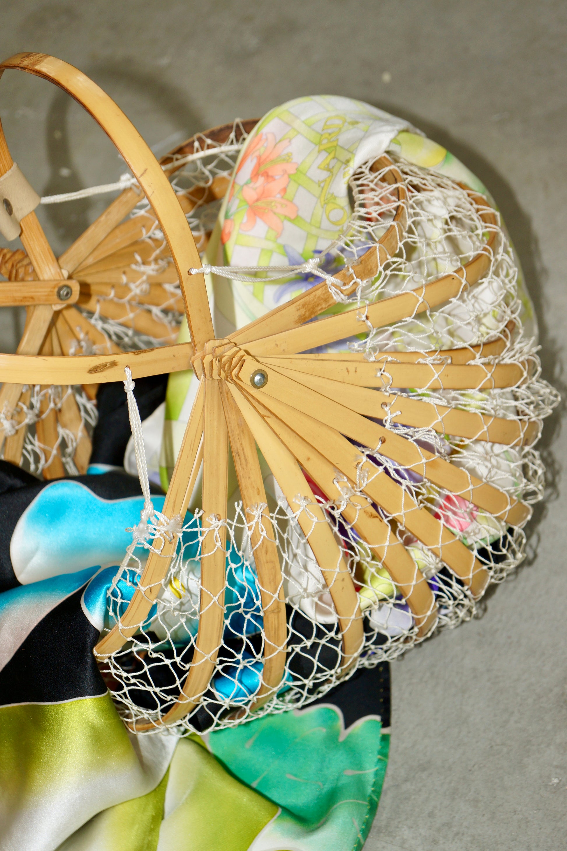 A sculptural statement piece with quiet charm. This vintage Japanese basket bag features bentwood slats in a fan-like silhouette, held together by delicate white netting. Lightweight yet sturdy, it’s both an art object and a functional purse.