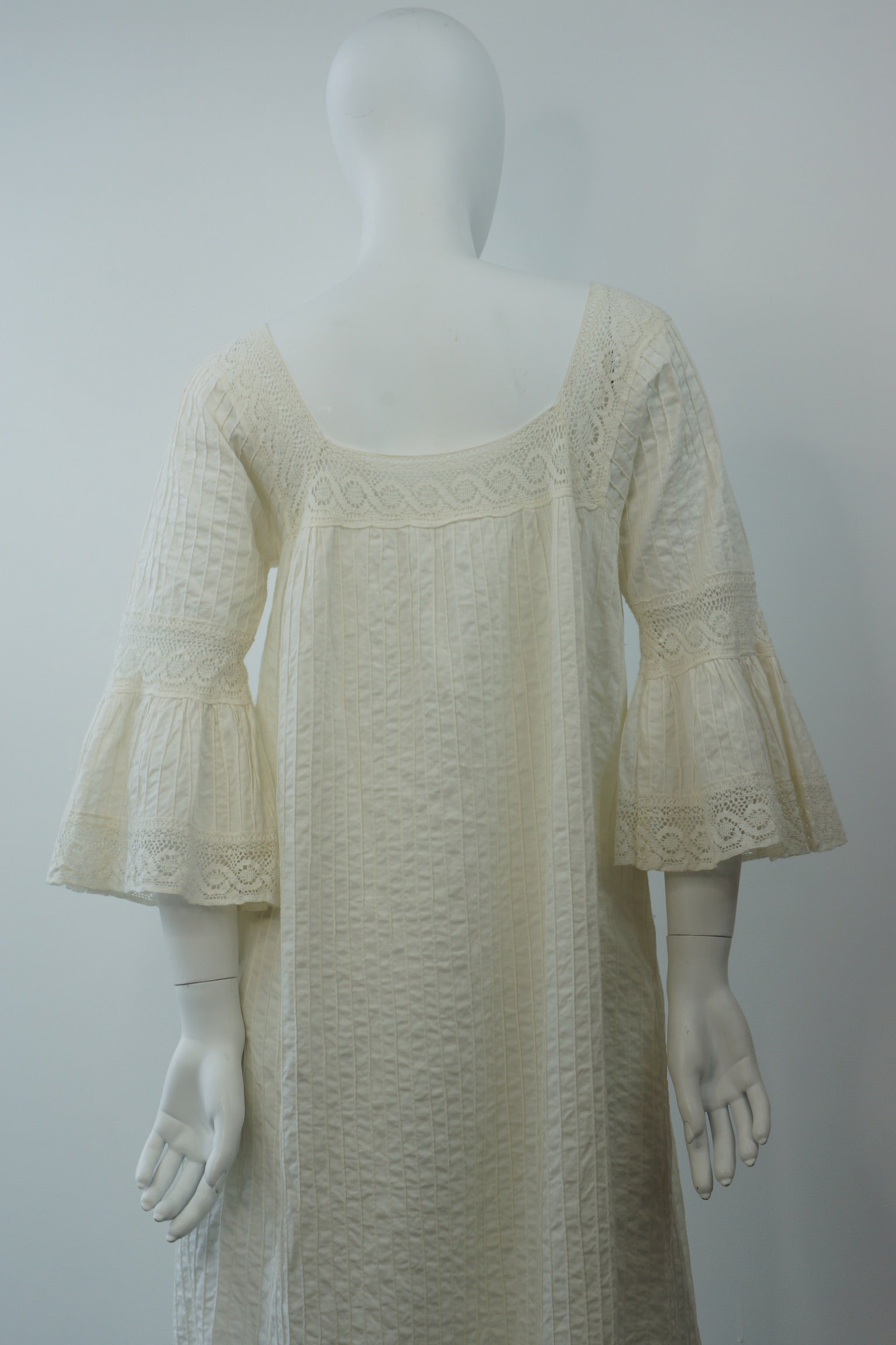 Embrace bohemian romance with this stunning, 1970's pin tucked white maxi dress, reminiscent of a traditional Mexican wedding gown. Crafted from a textured lightweight cotton, this dress features a graceful square neckline and elegant three-quarter length bell sleeves adorned with delicate lace trim. Intricate horizontal bands of lace embellish the skirt, adding a touch of artisanal charm. Its relaxed, flowing silhouette makes it perfect for a dreamy and unforgettable wedding celebration or a special life occasion. Walk barefoot in this dress. Oh wait I forgot to mention the best part, it has pockets!