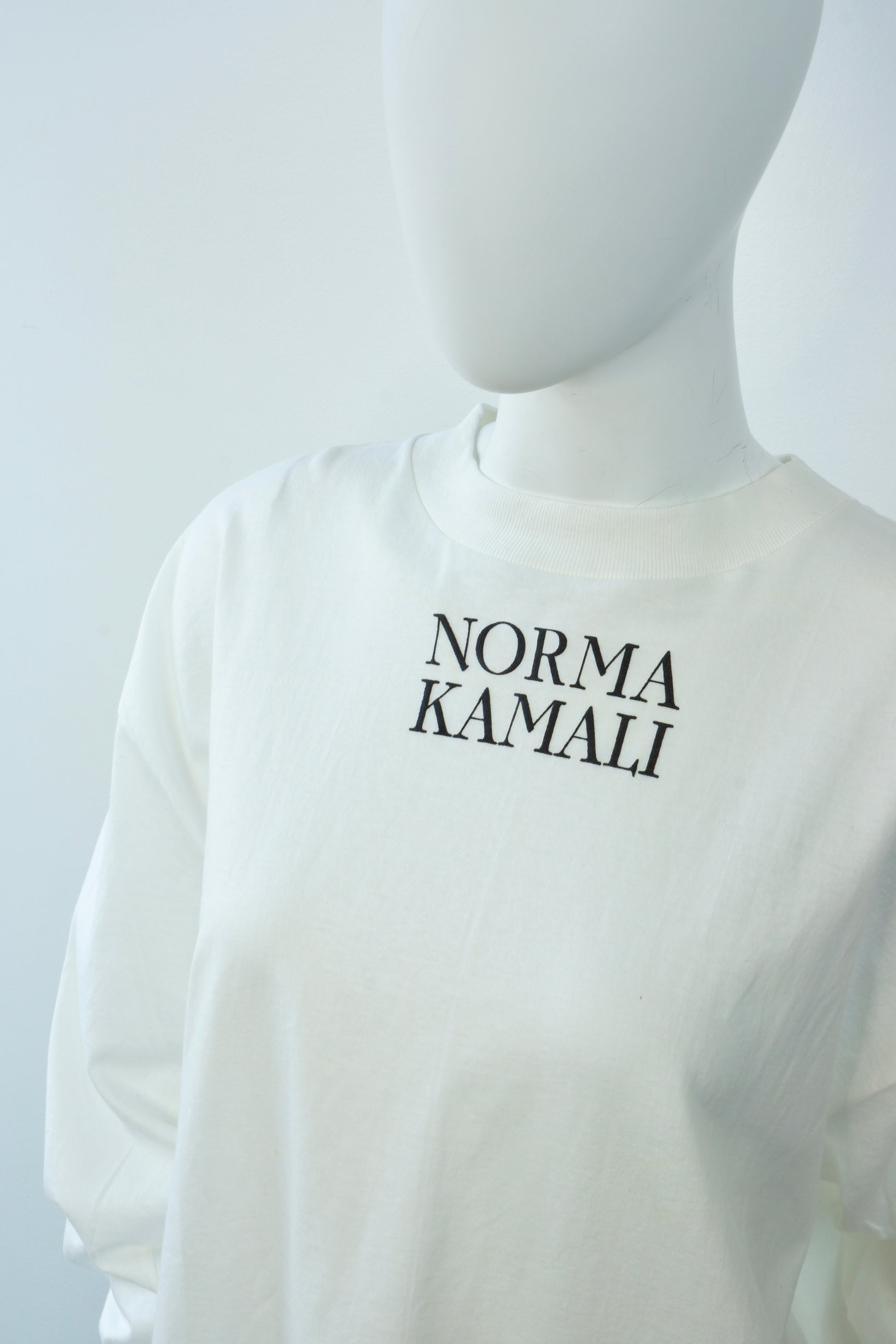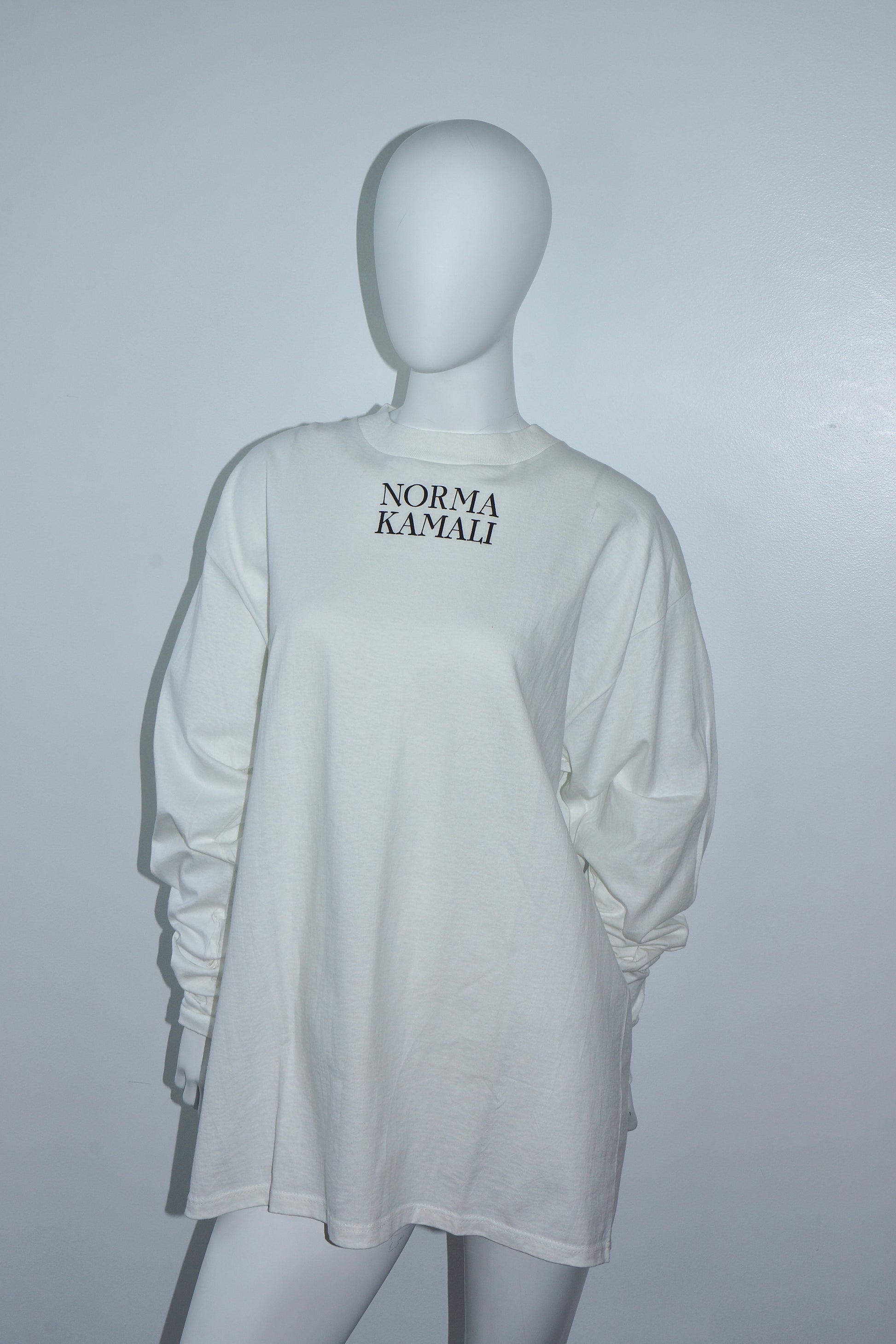 Embrace minimalist chic with this Norma Kamali long-sleeved t-shirt. The simple yet recognizable "NORMA KAMALI" logo adds a touch of designer flair to this essential white tee. Made from soft cotton fabric with a crew neck and a relaxed silhouette, it's perfect for effortless style and comfort. Made in Italy.