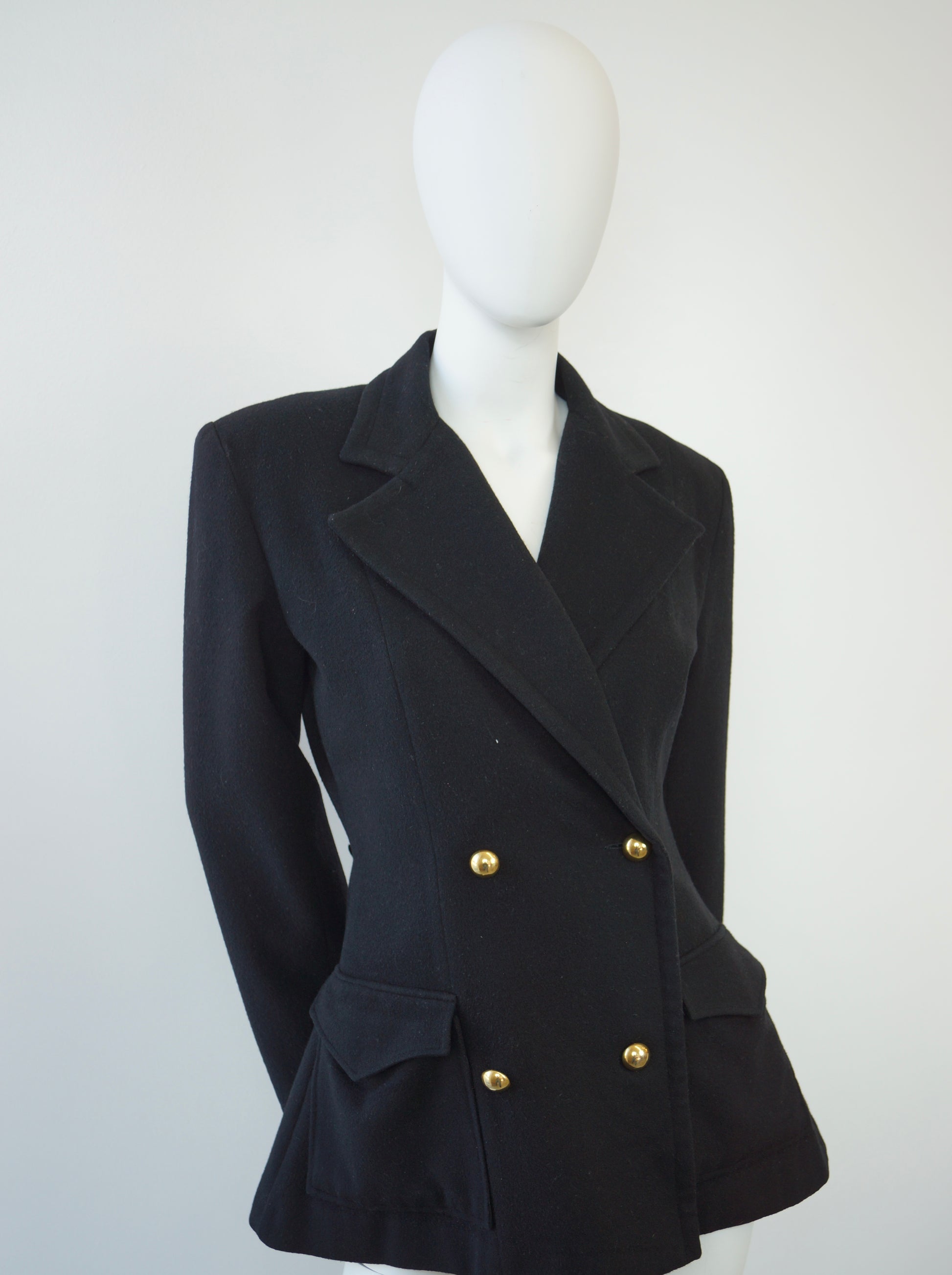 Patrick Kelly Double Breasted Blazer/Jacket. Own a piece of history with this garment. Black, wool double breasted with gold buttons. 2 flap pockets at the hips. Lapel collar. Structured shoulders and a slightly flared silhouette at the bottom.