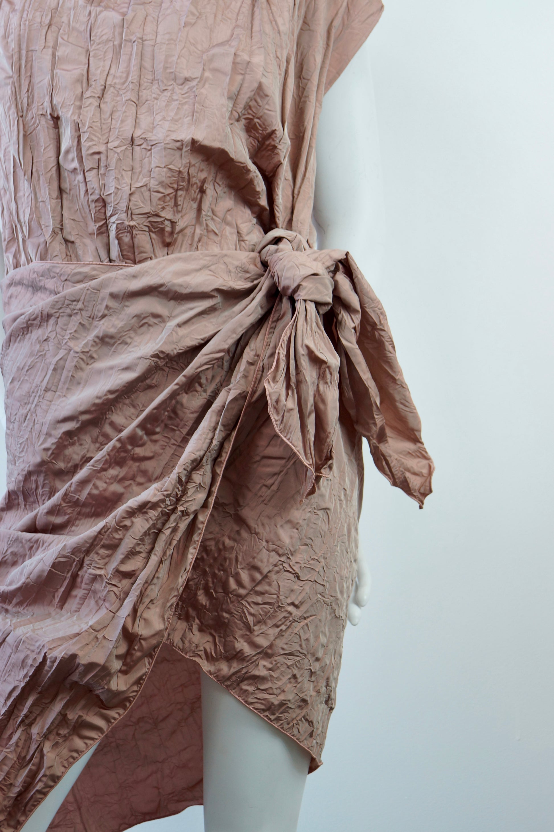 Discover the understated elegance of this Valeria Bosco draped dress. The muted, dusty rose hue with a slight iridescent sheen complements the unique silk blend textured fabric, offering both visual interest and comfortable wear. The wide neckline and short sleeves create a relaxed feel, while the integrated waist tie allows for personalized shaping and enhances the draped, wrap-style skirt. A signature piece that embodies effortless Italian style. A great piece to travel with, take me to Europe.
