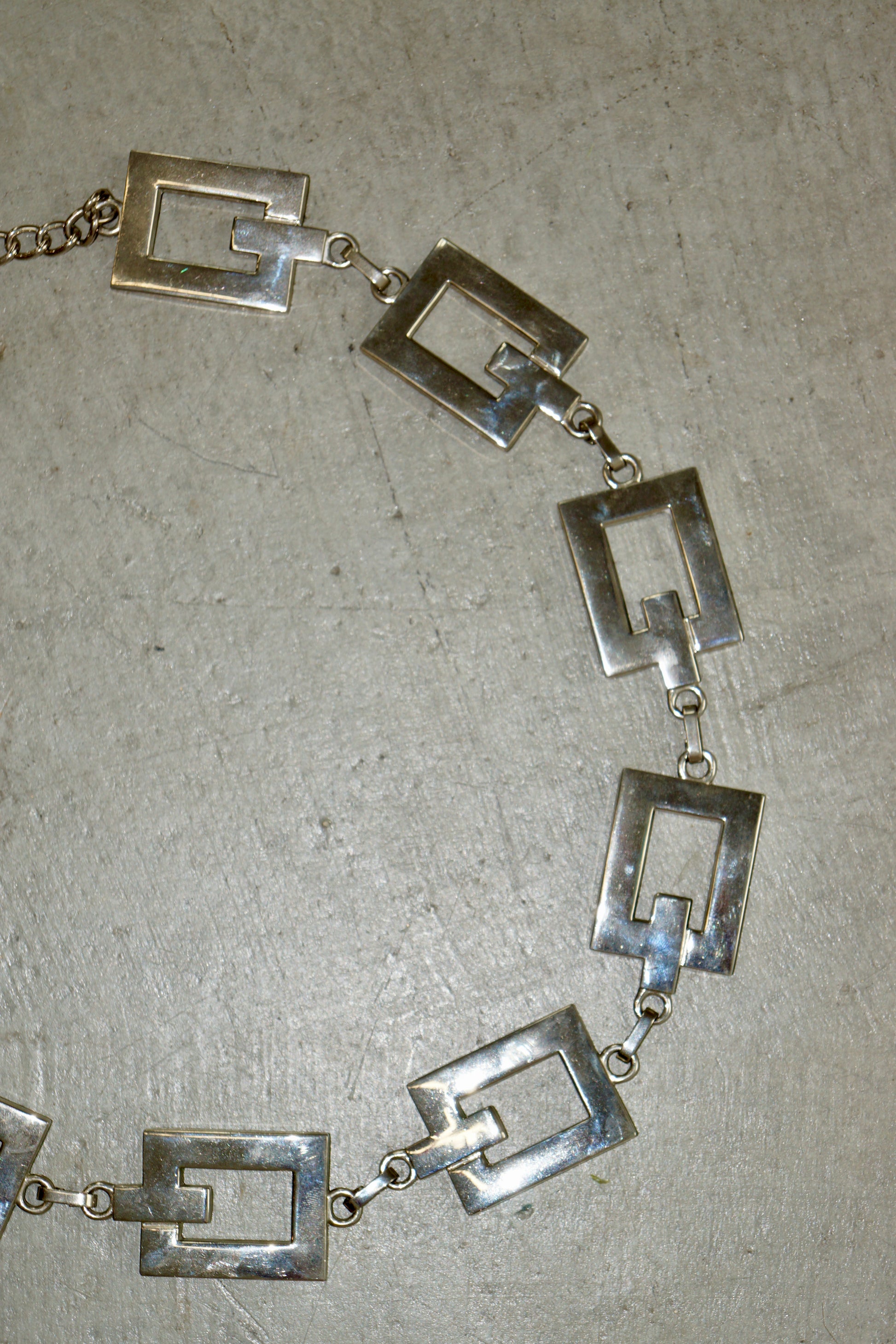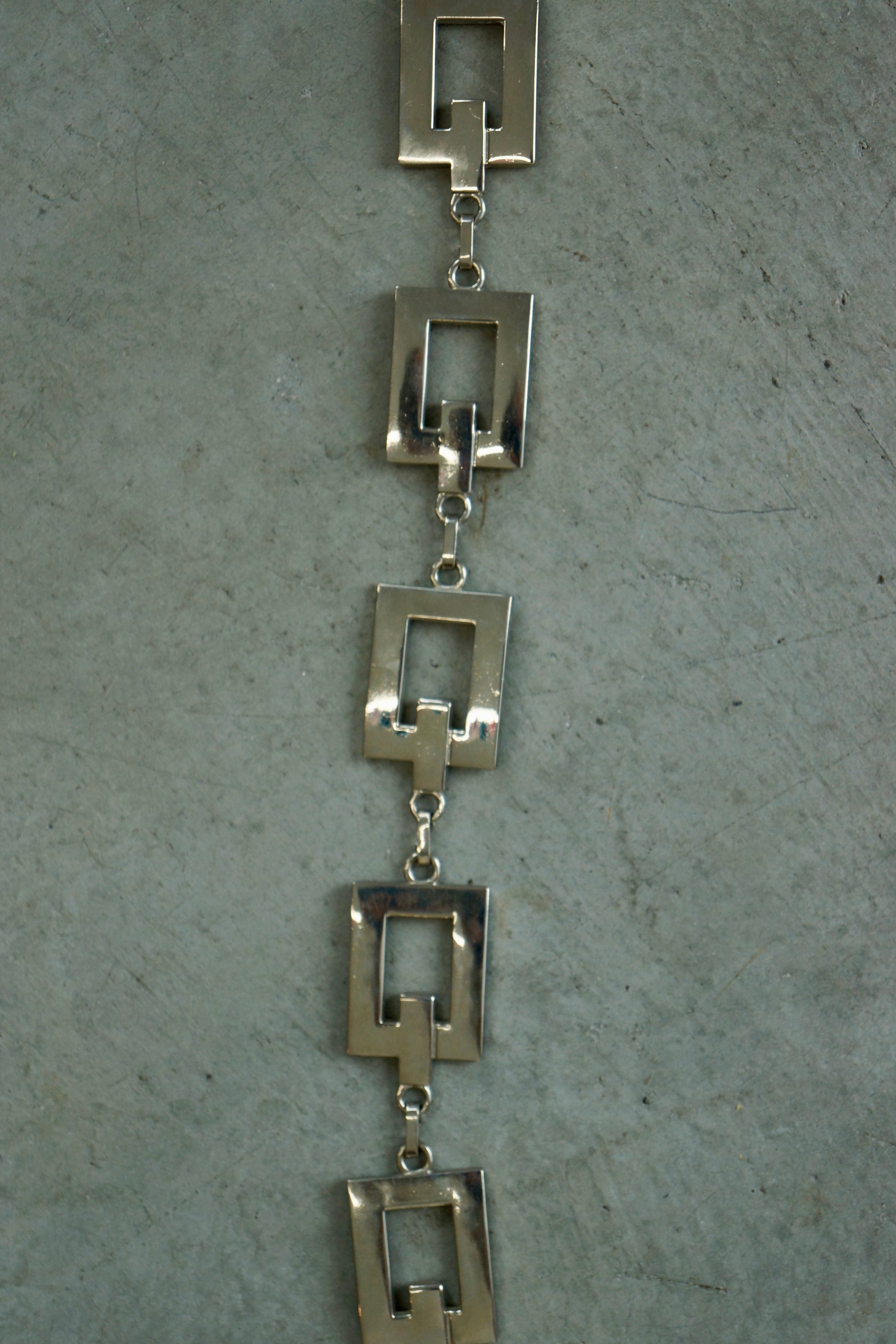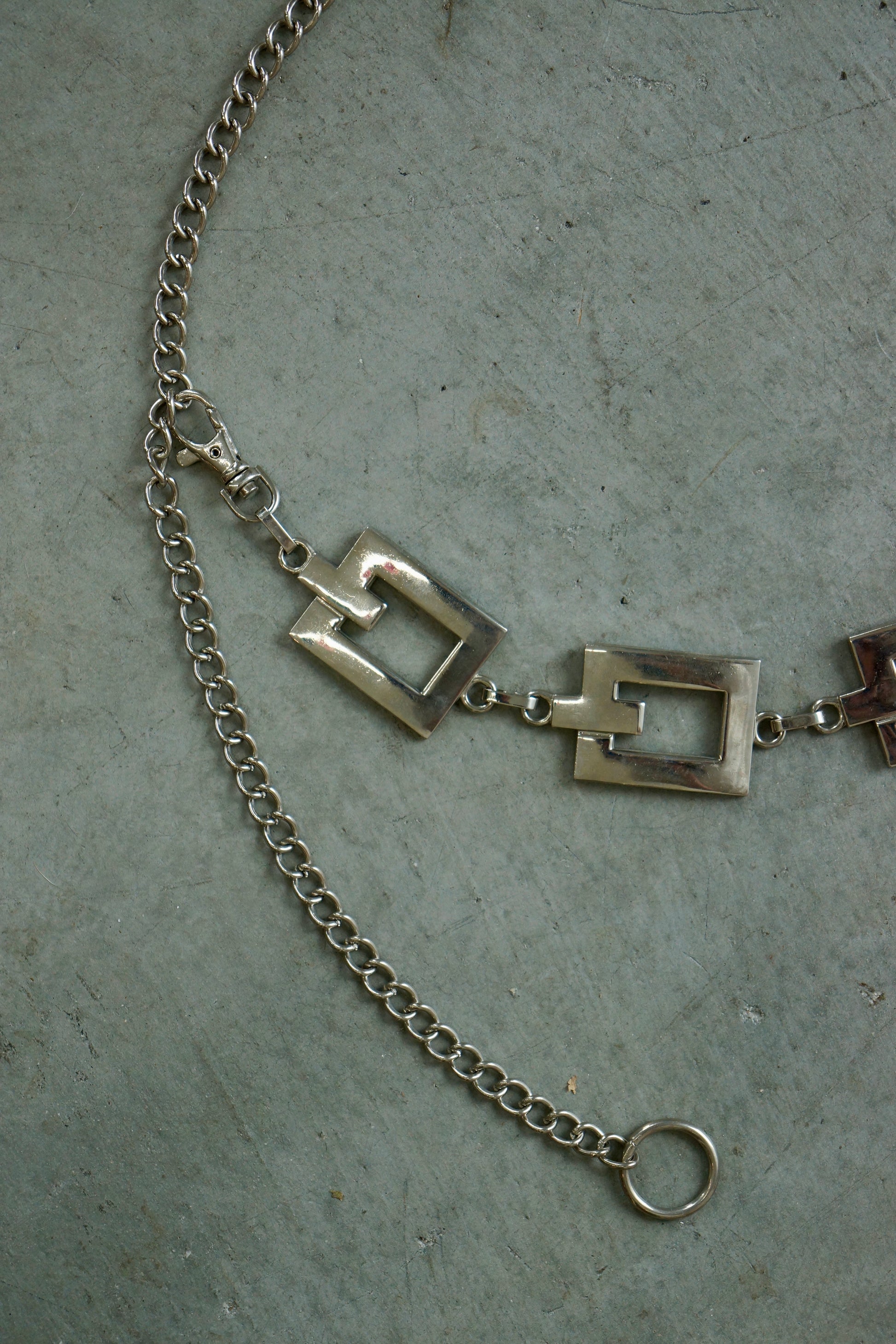 A sleek, sculptural statement piece, this vintage silver-tone belt features a series of interlocking rectangular links with cut-out geometric detailing. The bold, modernist design adds structure and shine to any look, from jeans to dresses. Adjustable with a chain extender, it can be worn at the waist or hips for versatile styling. It's very Miu Miu Spring 2025.