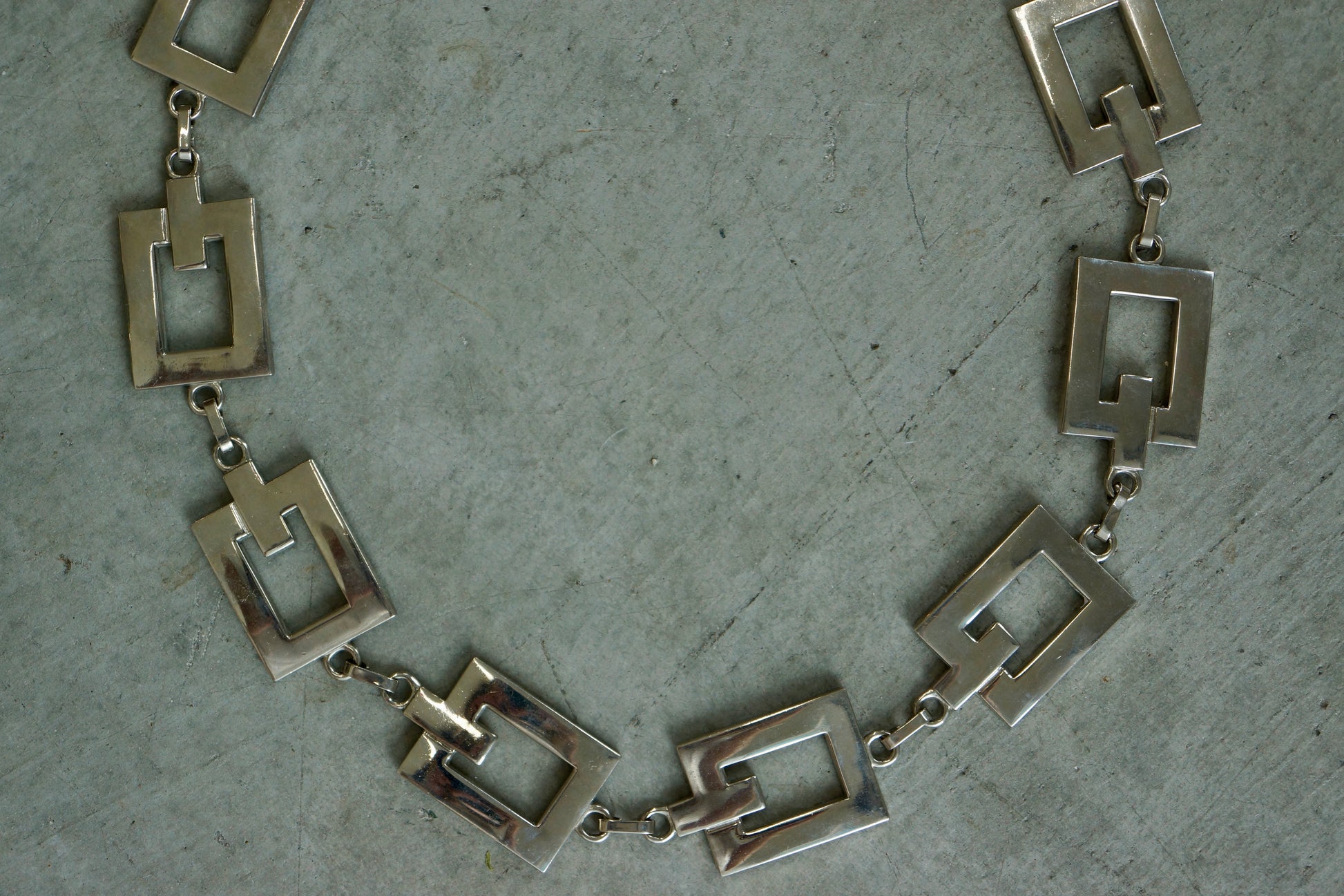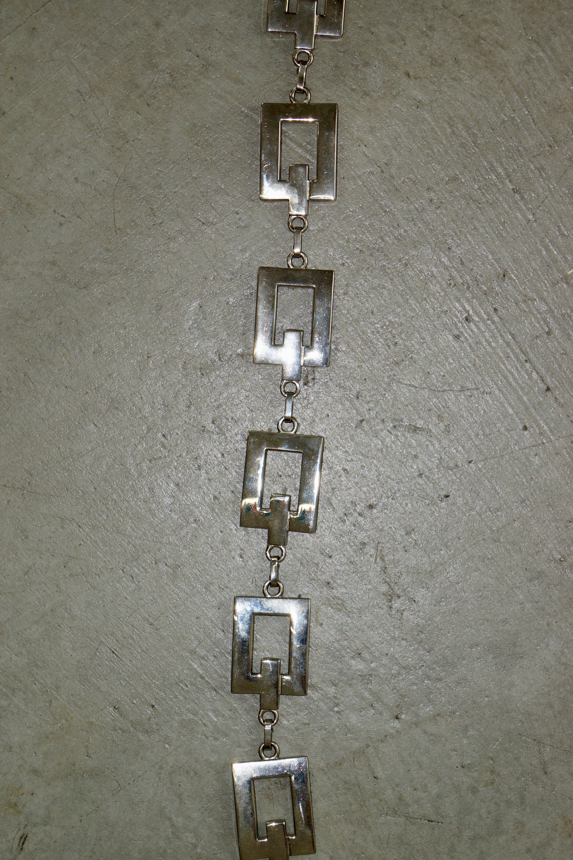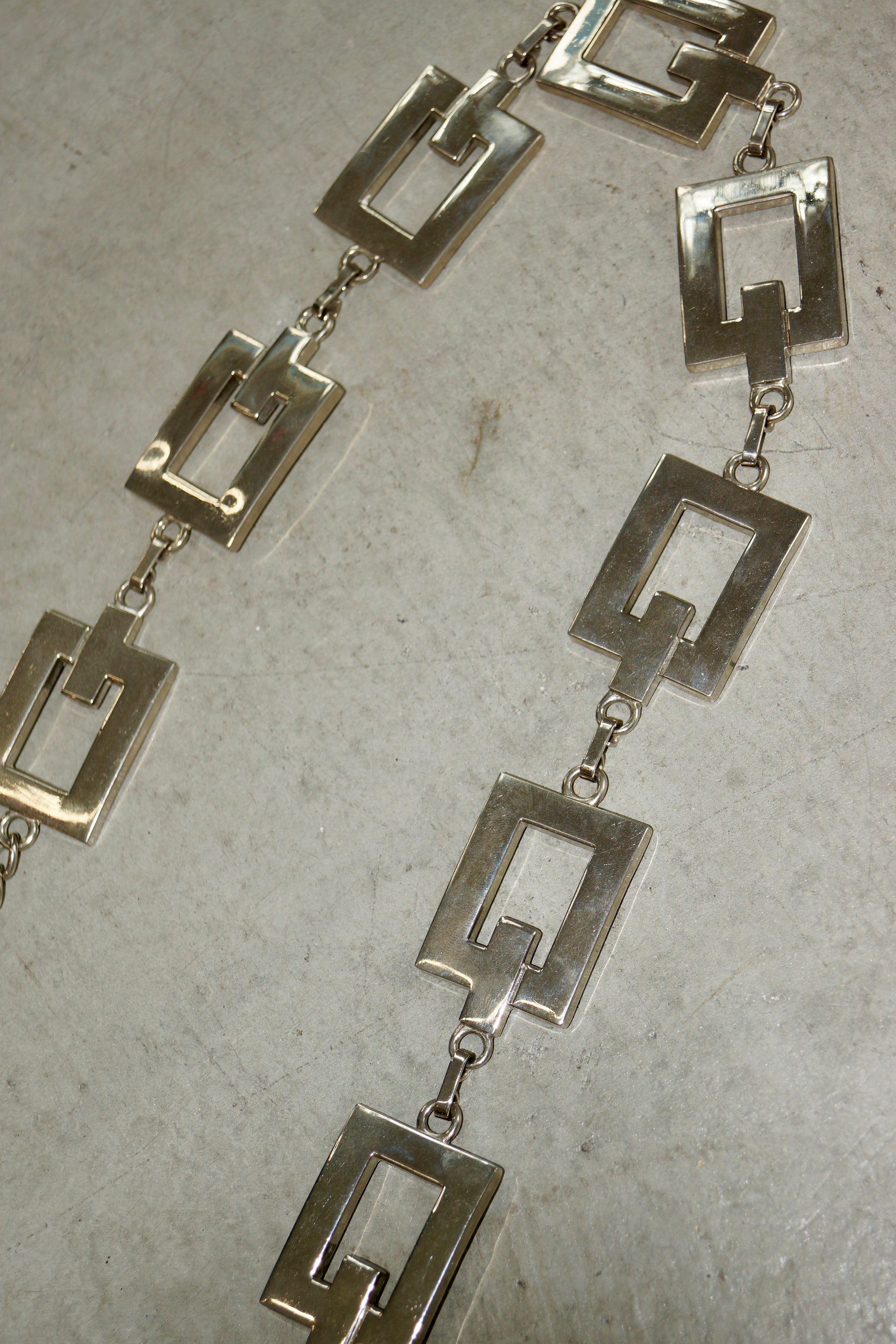 A sleek, sculptural statement piece, this vintage silver-tone belt features a series of interlocking rectangular links with cut-out geometric detailing. The bold, modernist design adds structure and shine to any look, from jeans to dresses. Adjustable with a chain extender, it can be worn at the waist or hips for versatile styling. It's very Miu Miu Spring 2025.