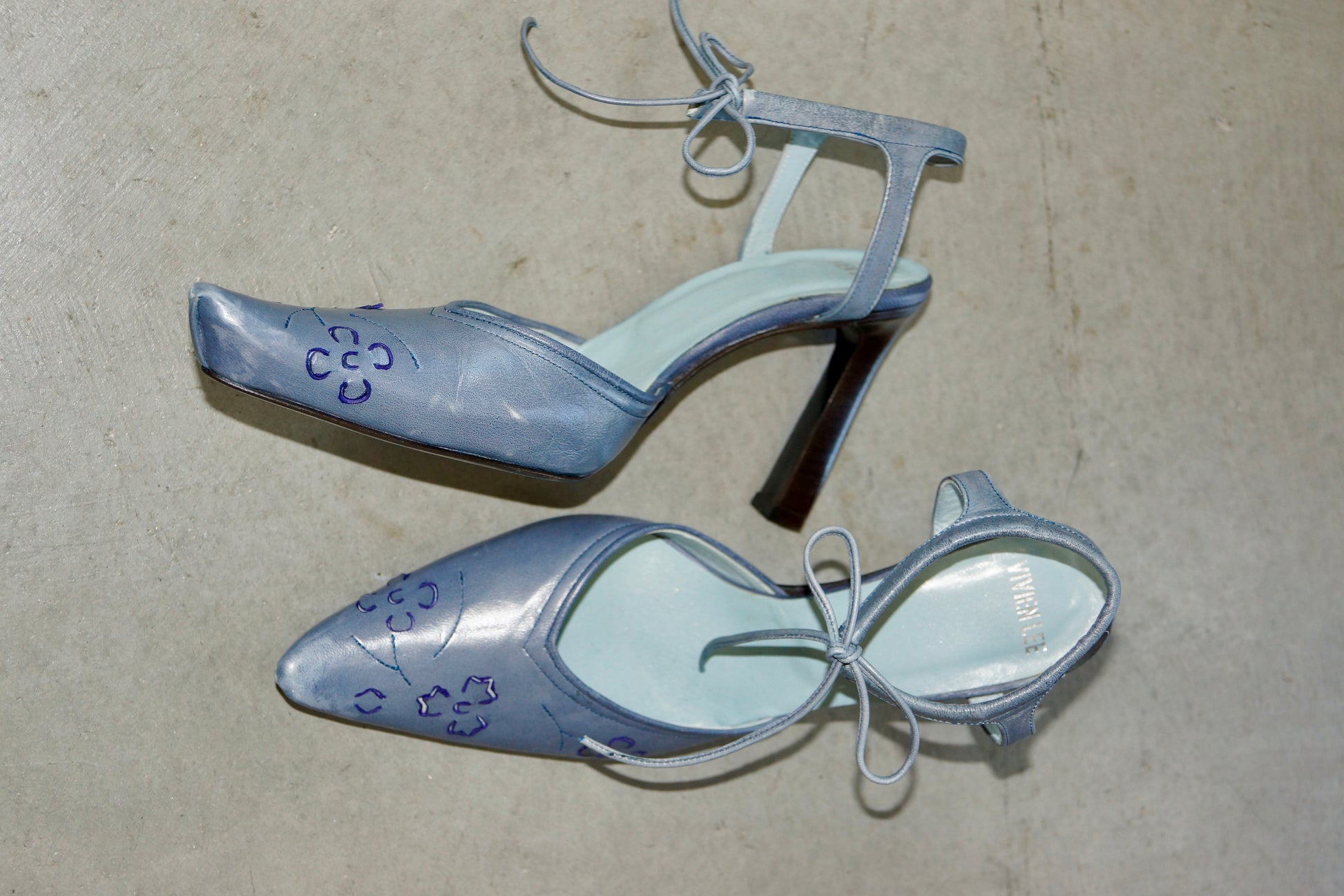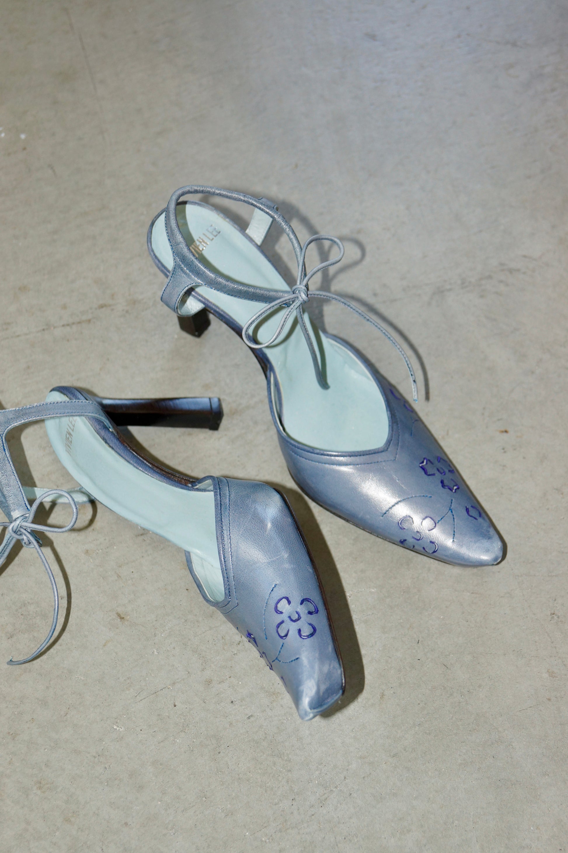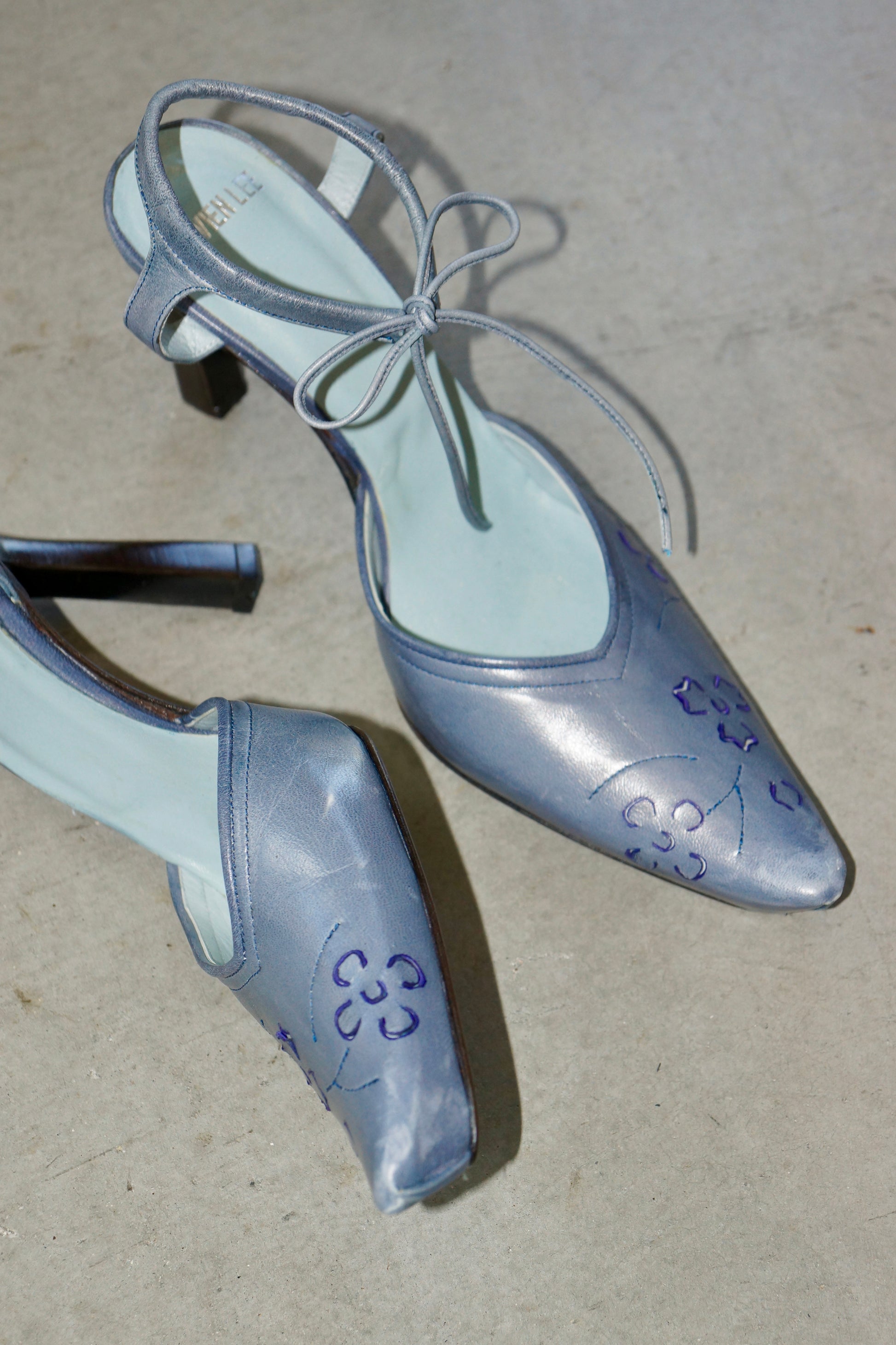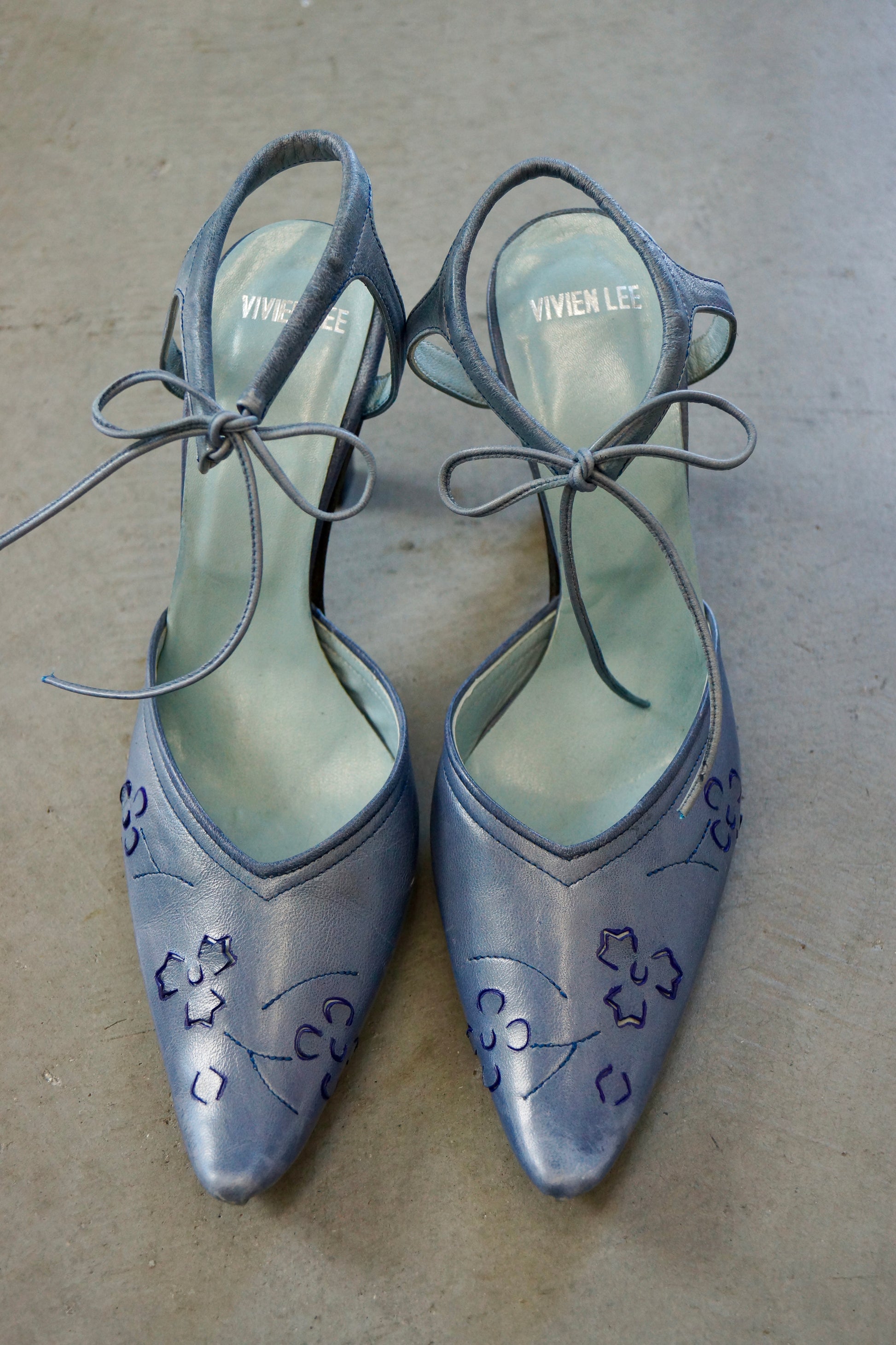 Vivien Lee Blue Pumps with ankle tie. Leather with floral cut outs at the toe.